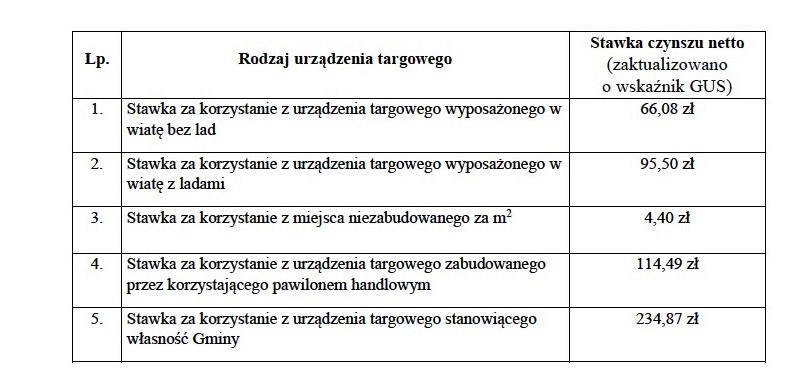 Od 1 stycznia 2025 roku obowiązują stawki wprowadzone na podstawie Zarządzenia Nr 3/2025 Dyrektora Miejskiego Zarządu Budynków Komunalnych w Kędzierzynie-Koźlu z dnia 21 stycznia 2025 roku w sprawie zmiany stawek czynszu za korzystanie z urządzeń targowych, pobieranie opłat za założenie na budynkach reklam i szyldów, wywoławczych stawek czynszu za najem lokali użytkowych oraz stawek czynszu za dzierżawę gruntów w trybie bezprzetargowy miesięczne stawki czynszu za korzystanie z urządzeń targowych zgodnie z poniższą tabelą.