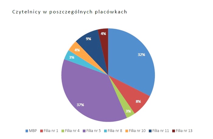 Najwięcej czytelników (69 proc.), korzysta z usług w dwóch największych agendach, które dysponują najszerszą ofertą kulturalną i informacyjną. Z bibliotek tych, ze względu na lokalizację, korzystają wszyscy mieszkańcy, natomiast z poszczególnych filii głównie mieszkańcy danego osiedla.