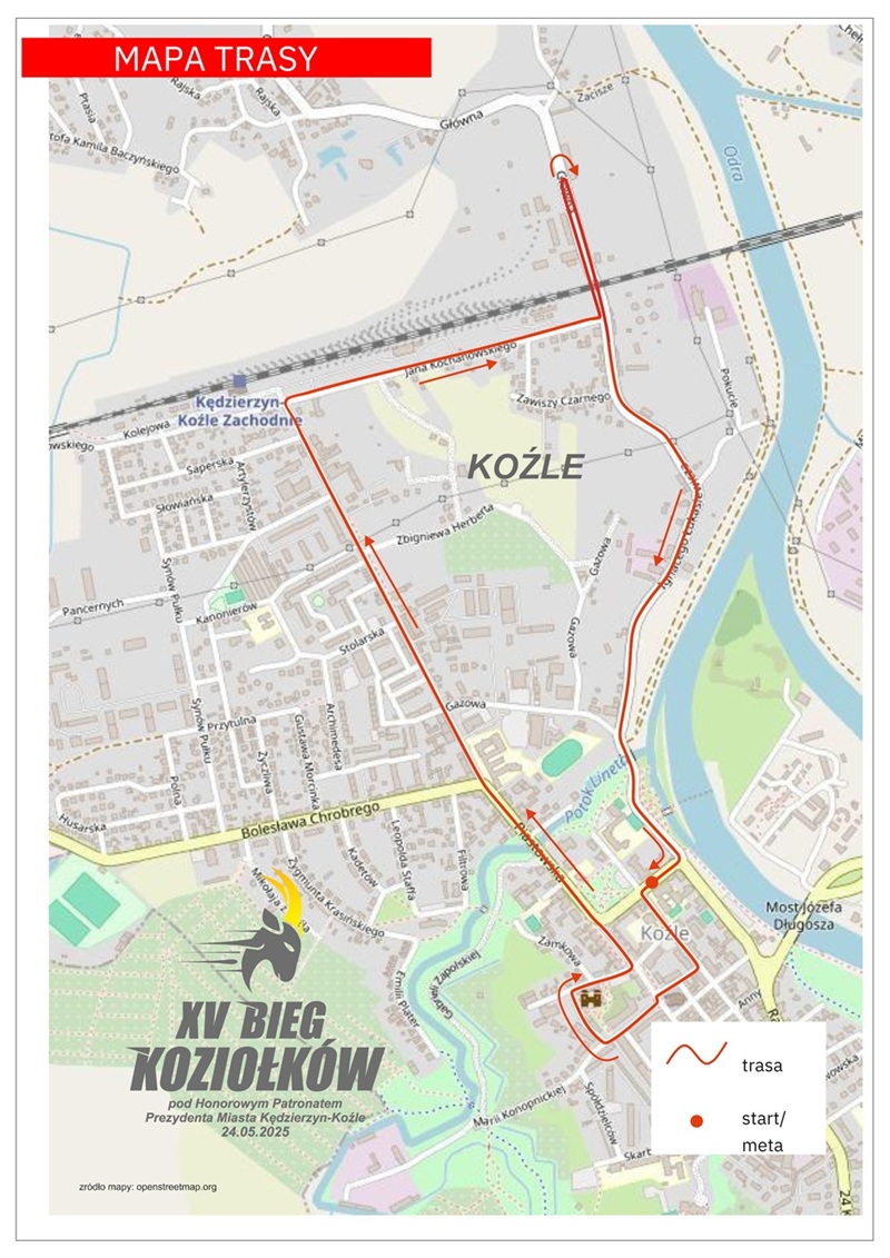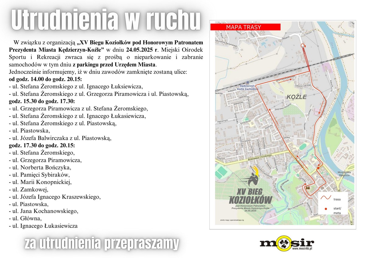 W związku z organizacją biegu ulicznego na 5 i 10 km w sobotę 24 maja część ulic w Koźlu zostanie zamknięta dla ruchu. Miejski Ośrodek Sportu i Rekreacji zwraca się z prośbą o nieparkowanie i zabranie samochodów w tym dniu z parkingu przed Urzędem Miasta. W dniu zawodów zamknięte zostaną następujące ulice w godzinach: