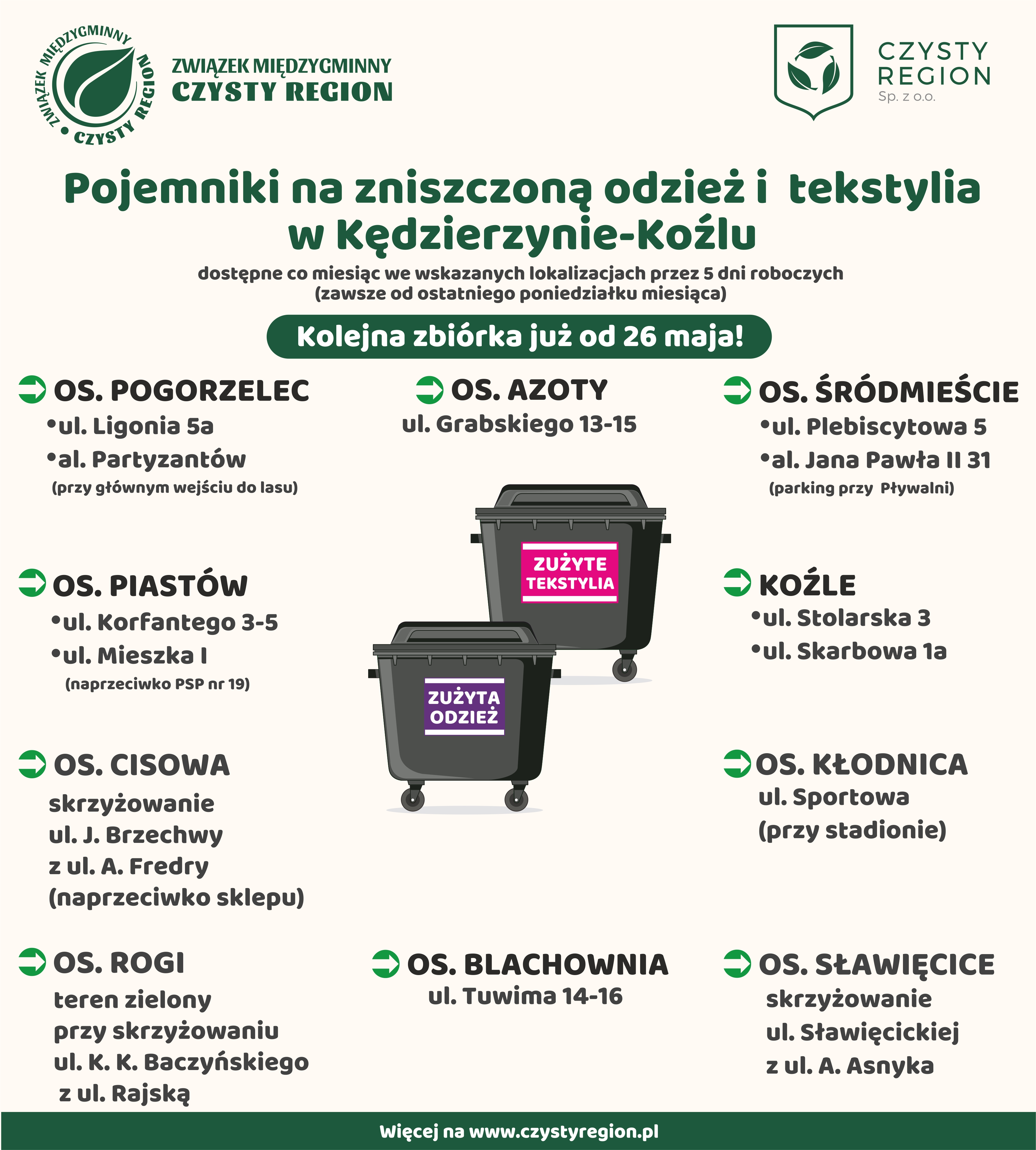 W większości gmin w Polsce mieszkańcy są zobowiązani do oddawania tych odpadów wyłącznie w PSZOK. Związek, wychodząc poza zakres ustawowych obowiązków, podjął dodatkowe działania w trosce o wygodę mieszkańców. Jednocześnie apeluje, że tylko zniszczona odzież i tekstylia powinny wyrzucane do pojemników. Te dobrej jakości, niepotrzebne, ale zdatne do użytku powinny dostać drugie życie. Można to zrobić m.in. korzystając z pojemników PCK, zbiórek fundacji, nadać „ekozwrot” przez paczkomat lub za pośrednictwem strony ubraniadooddania.pl, a także oddać w popularnych sieciówkach w kędzierzyńskiej galerii.