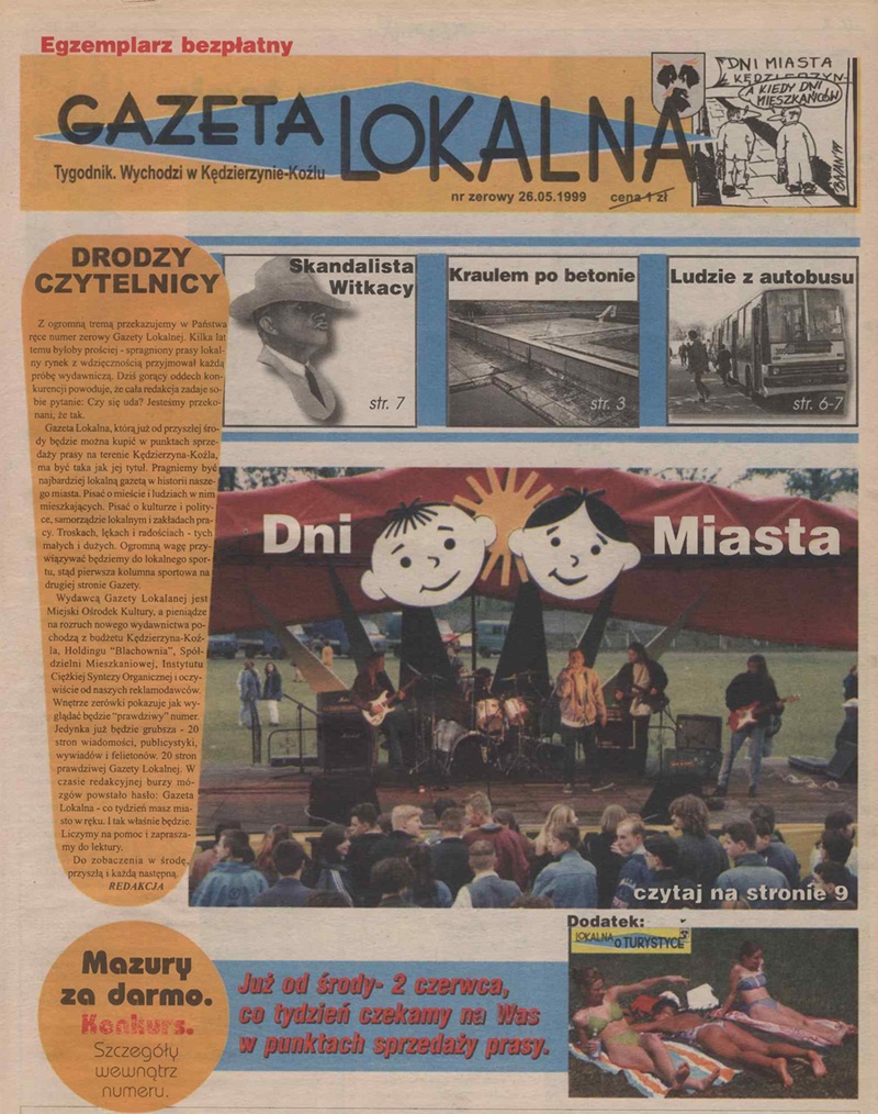 Numer zerowy nowego wydawnictwa na kędzierzyńsko-kozielskim rynku prasowym ukazał się 26 maja 1999 roku. Redaktorem naczelnym był Piotr Gabrysz. Wydawcą był Miejski Ośrodek Kultury, a redakcja mieściła się w Domu Kultury "Lech". Gazeta rozwijała się z numeru na numer, przybywało stron, tematów i współpracowników. Drugi numer z 2000 roku przyniósł istotną informację. Redakcja przeniosła swoją siedzibę z Blachowni do Domu Kultury „Chemik”. W marcu 2000 roku Piotr Gabrysz przestał być redaktorem naczelnym, a wkrótce zastąpił go Andrzej Szopiński-Wisła (zmarł 22.09.2022 r.). Od 90. numeru „Lokalna” dorobiła się dwóch dziennikarzy na etatach. Z rangi współpracowników awansowali Agnieszka Kurpińska i Grzegorz Łabaj.