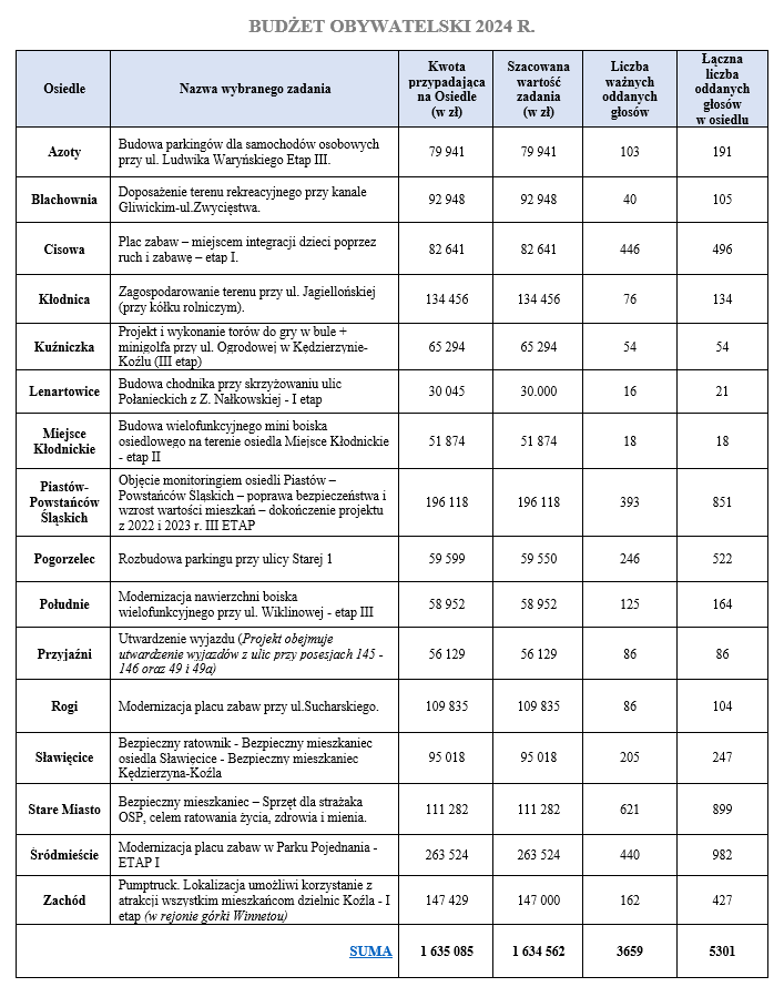 Budżet obywatelski, nazywany też budżetem partycypacyjnym, to wydzielona część budżetu miasta, o której wydatkowaniu decydują bezpośrednio sami mieszkańcy. Realizowany jest on na wszystkich 16 osiedlach. Przeznaczona do wydatkowania kwota w 2025 roku wynosi 1 791 292 zł. Podział pieniędzy na poszczególne osiedla przedstawia się następująco: Azoty – 79 936 zł, Blachownia – 92 066 zł, Cisowa – 83 192 zł, Kłodnica – 124 908 zł, Kuźniczka – 65 775 zł, Lenartowice – 55 122 zł, Miejsce Kłodnickie – 52 091 zł, Piastów–Powstańców Śląskich – 195 859 zł, Pogorzelec – 256 707 zł, Południe – 83 531 zł, Przyjaźni – 55 636 zł, Rogi – 69 404 zł, Sławięcice – 31 052 zł, Stare Miasto – 112 136 zł, Śródmieście – 286 293 zł, Zachód – 147 584 zł.