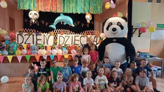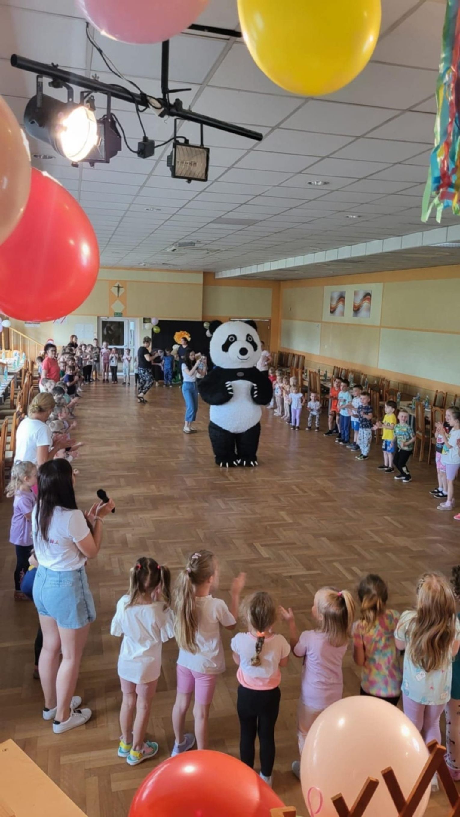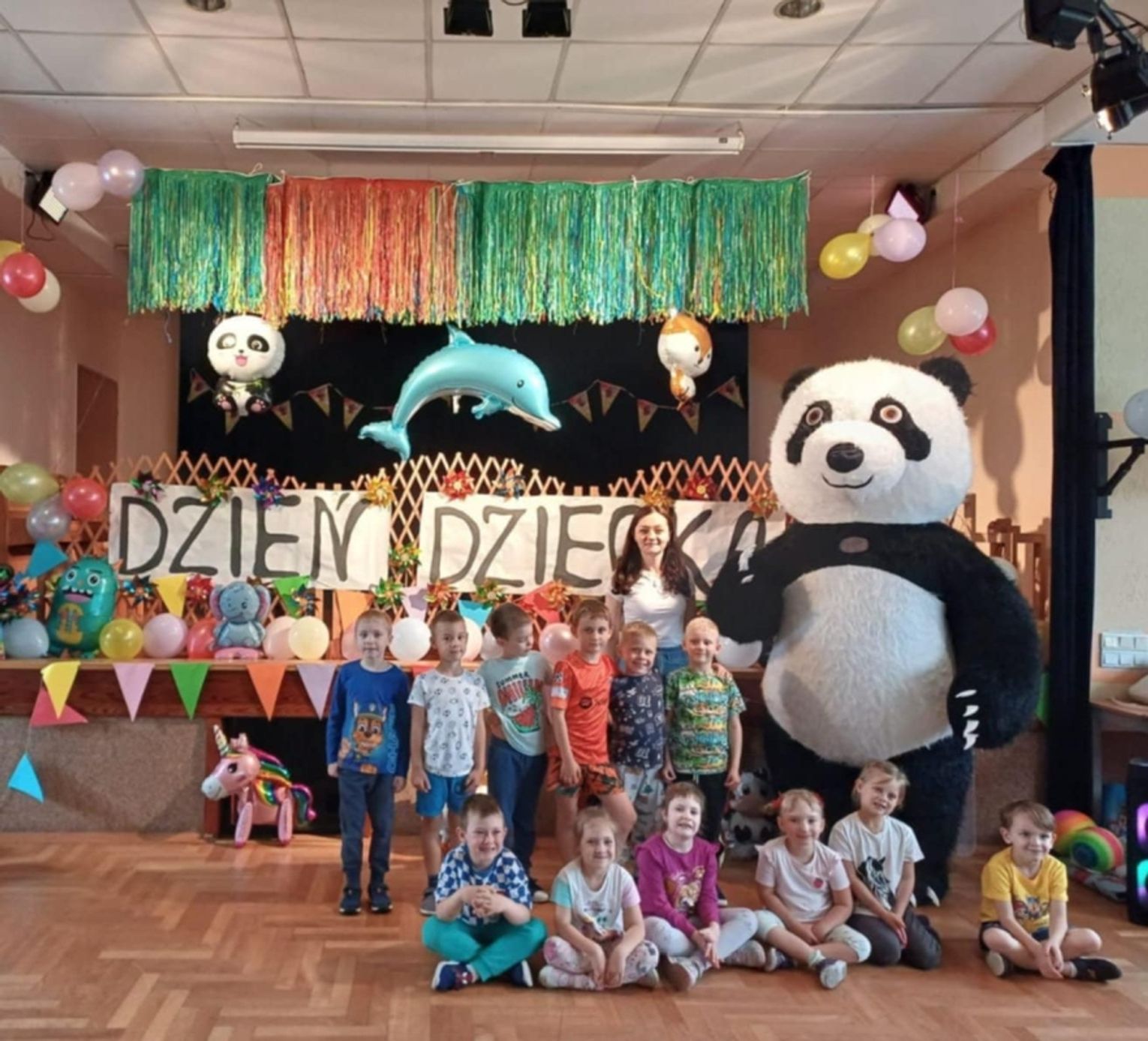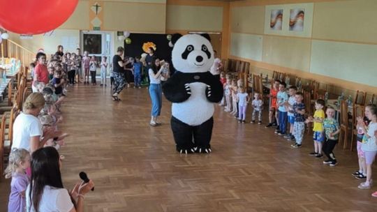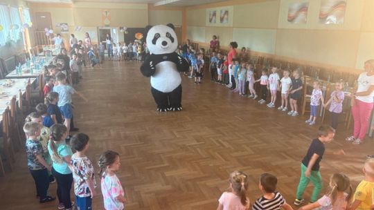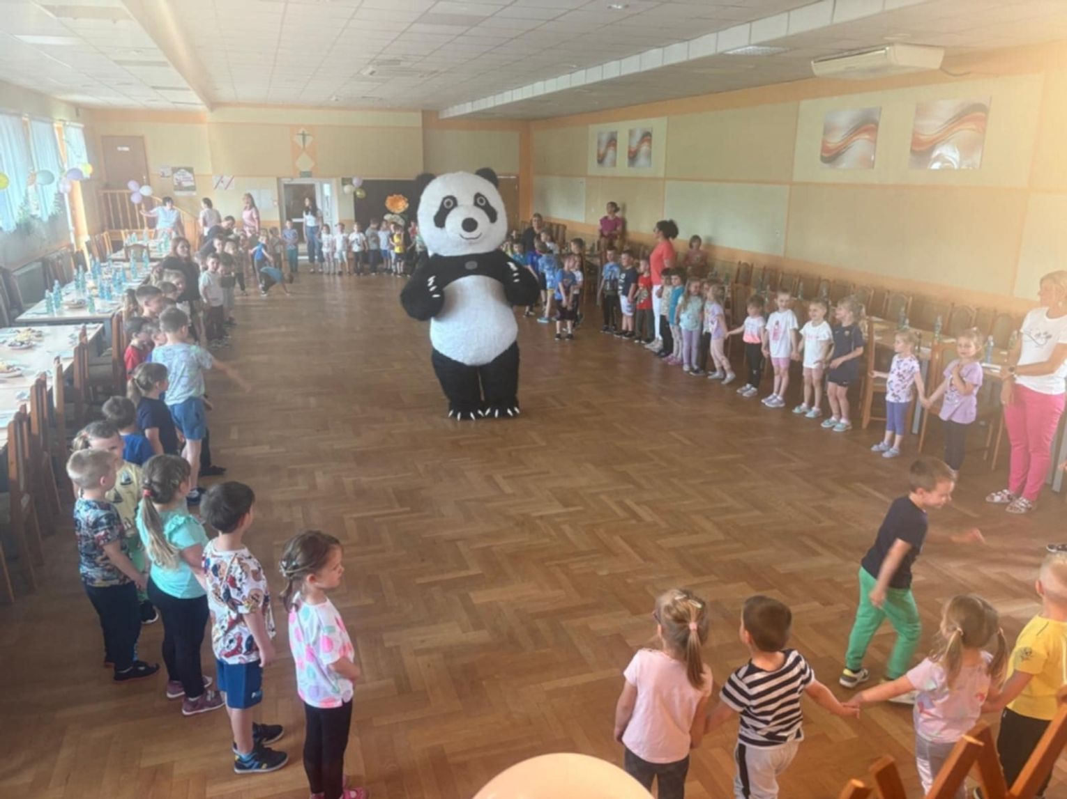 Sporą atrakcją - dosłownie i w przenośni - okazał się wielki miś panda, który nie tylko pozował do wspólnych zdjęć, ale również tańczył razem z dziećmi. Po intensywnych harcach przyszedł czas na chwilę wytchnienia - dzieci częstowały się sokiem, przekąskami, a na zakończenie czekała na nie grillowana kiełbaska.