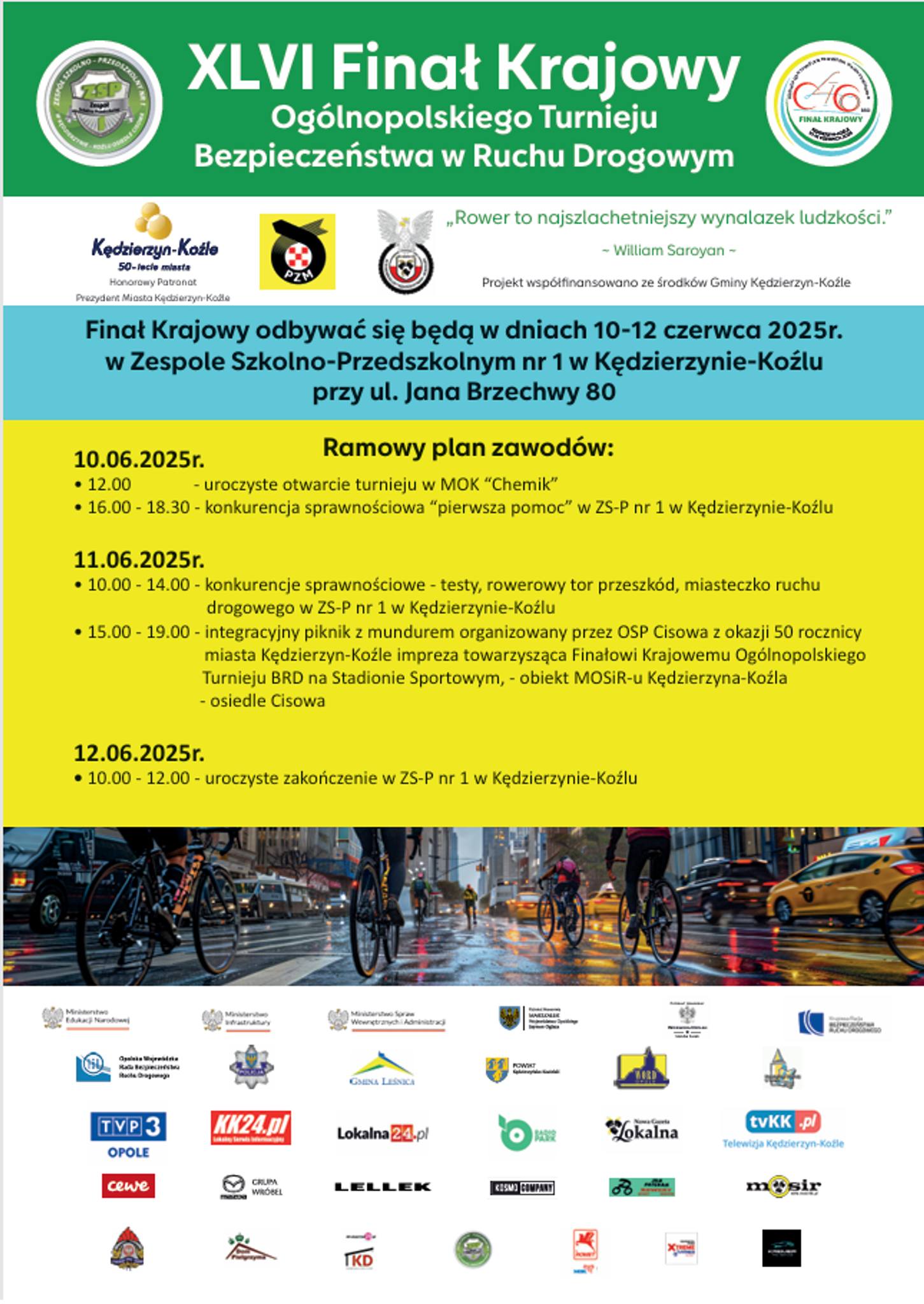 Wszystkie konkurencje odbywają się na terenie Zespołu Szkolno-Przedszkolnego nr 1 w Kędzierzynie-Koźlu, który od 30 lat aktywnie realizuje programy z zakresu bezpieczeństwa w ruchu drogowym.