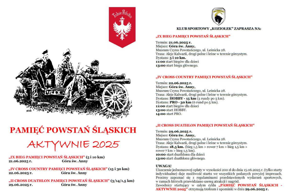 Klub Sportowy Koziołek z Kędzierzyna-Koźla zaprasza wszystkich pasjonatów sportu, historii oraz aktywnego stylu życia do udziału w wyjątkowym cyklu wydarzeń sportowych pn. „Pamięć Powstań Śląskich – Aktywnie 2025", które odbędą się na Górze Świętej Anny. To okazja do upamiętnienia bohaterów powstań śląskich poprzez udział w zawodach biegowych, kolarskich i duathlonie.