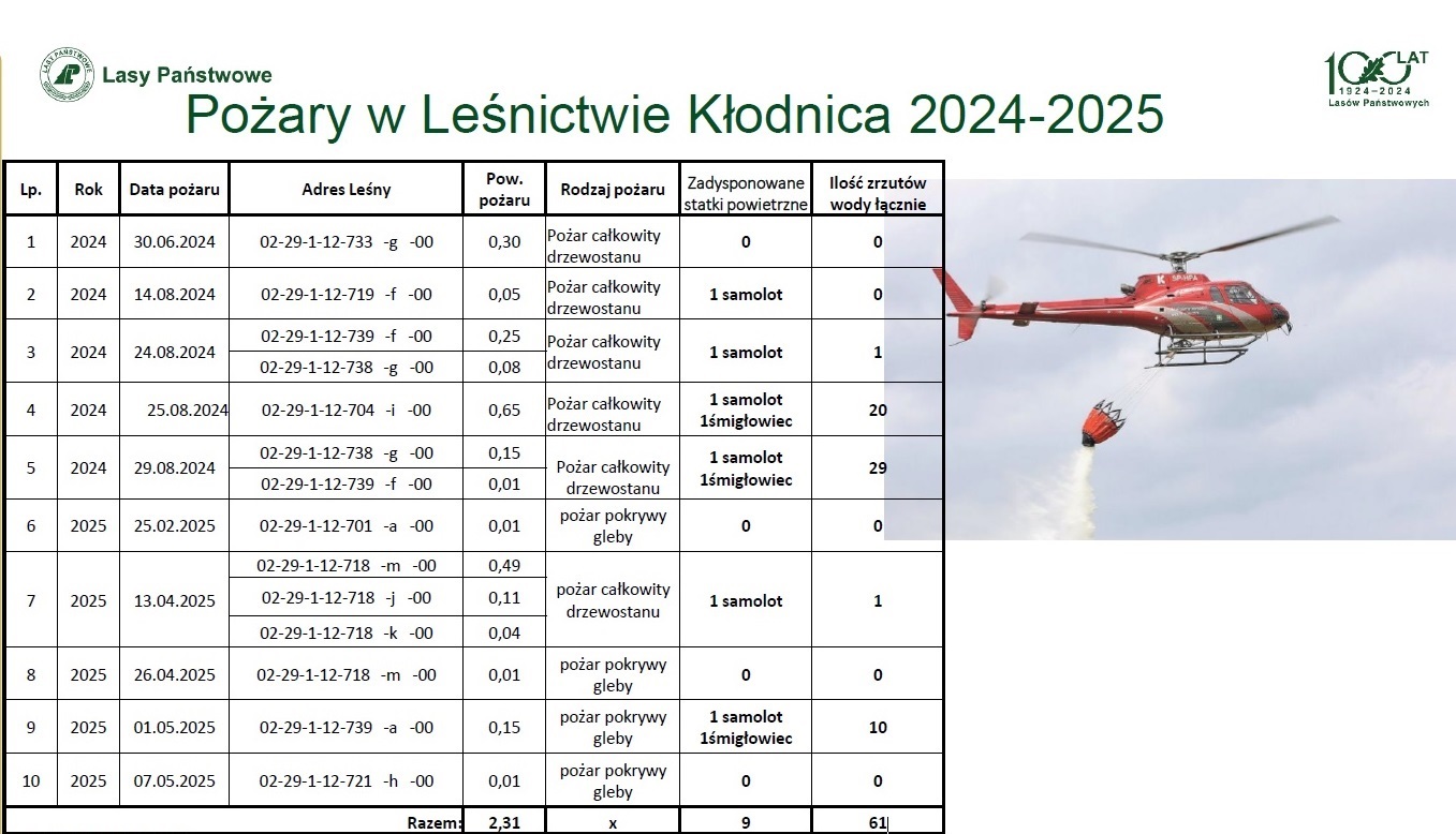 Oczywiście koszty wynikają nie tylko z poniesionych strat, czy też z racji prowadzenia akcji gaśniczych. Generują je również wszelkie działania związane z przeciwdziałaniem zagrożeniom. Koszty ochrony przeciwpożarowej w 2024 roku wyniosły łącznie 499 693 zł. Na tę kwotę składa się: utrzymanie systemu obserwacji naziemnej (206 113 zł); utrzymanie samolotów gaśniczych (157 893 zł); utrzymanie punktów czerpania wody (10 188 zł) oraz profilaktyka przeciwpożarowa na terenach leśnych (125 498 zł).