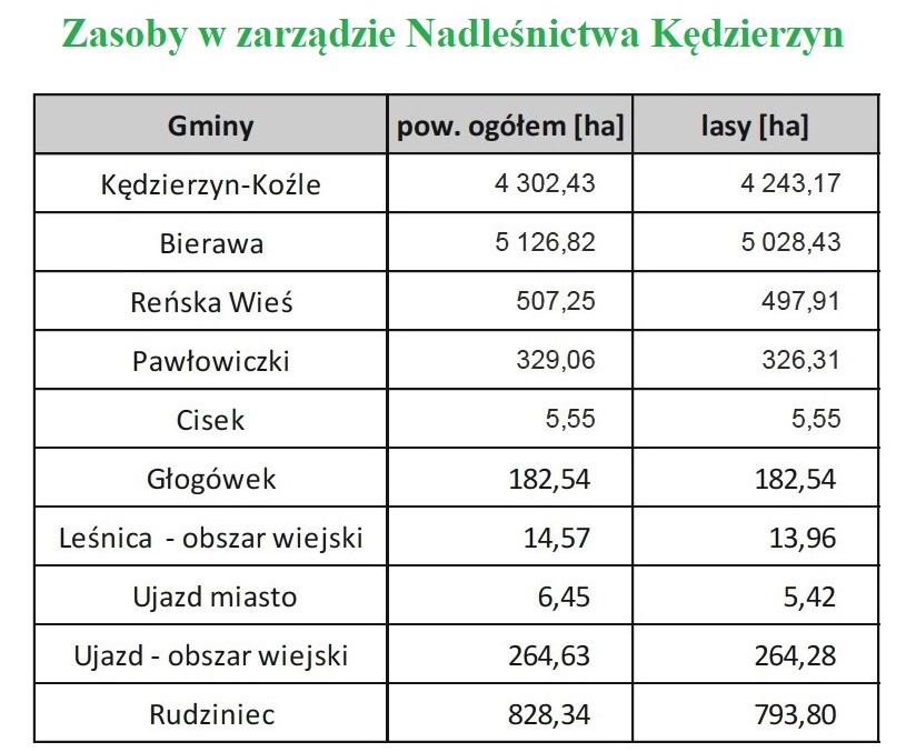 W Polsce funkcjonuje 429 nadleśnictw, które zarządzają lasami na poziomie lokalnym. Przykładowo w zarządzie Nadleśnictwa Kędzierzyn znajdują się tereny o powierzchni 11 567,65 ha (w tym lasów 11 361,37 ha). Średni wiek drzewostanu wynosi 49 lat. Nadleśnictwo Kędzierzyn to 10 leśnictw, gdzie zatrudnionych jest 40 osób. W ramach tej struktury organizacyjnej funkcjonuje łącznie 10 kancelarii leśnictw (w tym 4 samodzielne). Kontrola nad 67 kompleksami leśnymi o ogromnej powierzchni nie należy do najłatwiejszych.