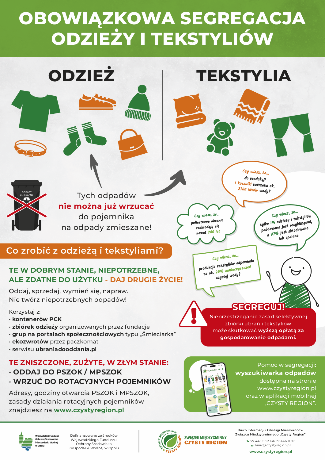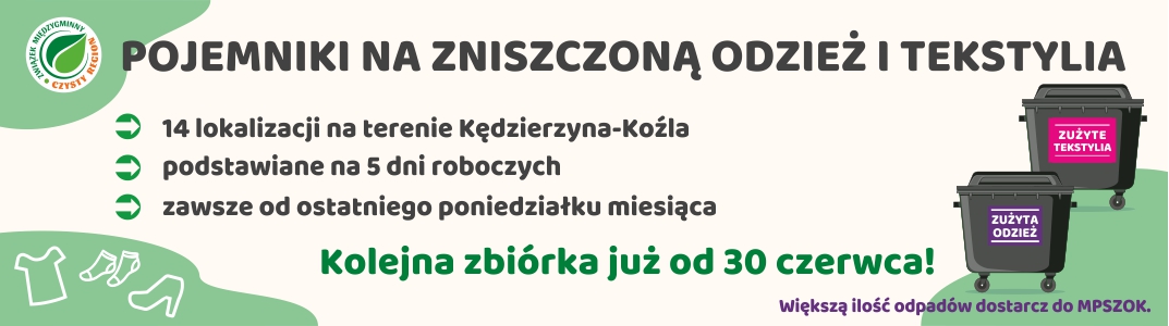 W większości gmin w Polsce mieszkańcy są zobowiązani do oddawania odzieży i tekstyliów wyłącznie w Punktach Selektywnej Zbiórki Odpadów Komunalnych (PSZOK). Związek Międzygminny „Czysty Region”, wychodząc poza zakres ustawowych obowiązków, podjął dodatkowe działania w trosce o wygodę mieszkańców – w wybranych lokalizacjach na okres 5 dni roboczych podstawia rotacyjne pojemniki na zniszczone, zużyte tekstylia i odzież. Jednocześnie apeluje, by wrzucać do nich wyłącznie te odpady, które nie nadają się do ponownego użytku. Te niepotrzebne, ale w dobrym stanie powinny dostać drugie życie.