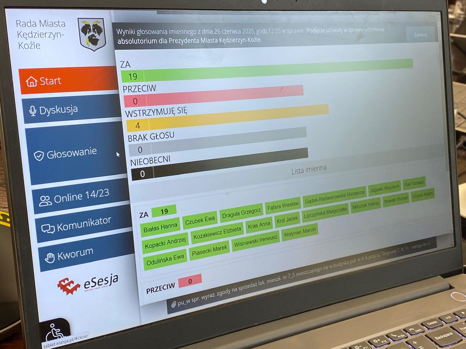 Pozytywną opinię w sprawie przyznania absolutorium wydały wcześniej Regionalna Izba Obrachunkowa i wszystkie komisje problemowe, w tym komisja rewizyjna. W głosowaniu nad wotum zaufania 17 radnych było "za", 6 wstrzymało się, nikt nie był przeciw. Prezydent otrzymała też absolutorium. Tu "za" głosowało 19 radnych, a 4 wstrzymało się od głosu.