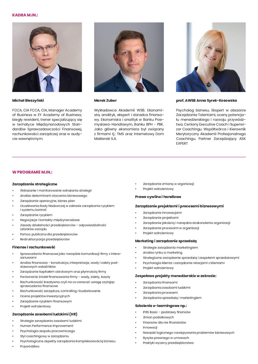 - kluczowi wykładowcy dostępni pod linkiem: Master of Business Administration (partner kierunku: EY) - Akademia WSB w zakładce KADRA. Z przyczyn konkurencyjnych, pełna lista wykładowców będzie dostępna po podpisaniu umowy,