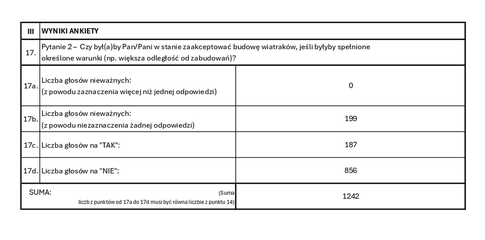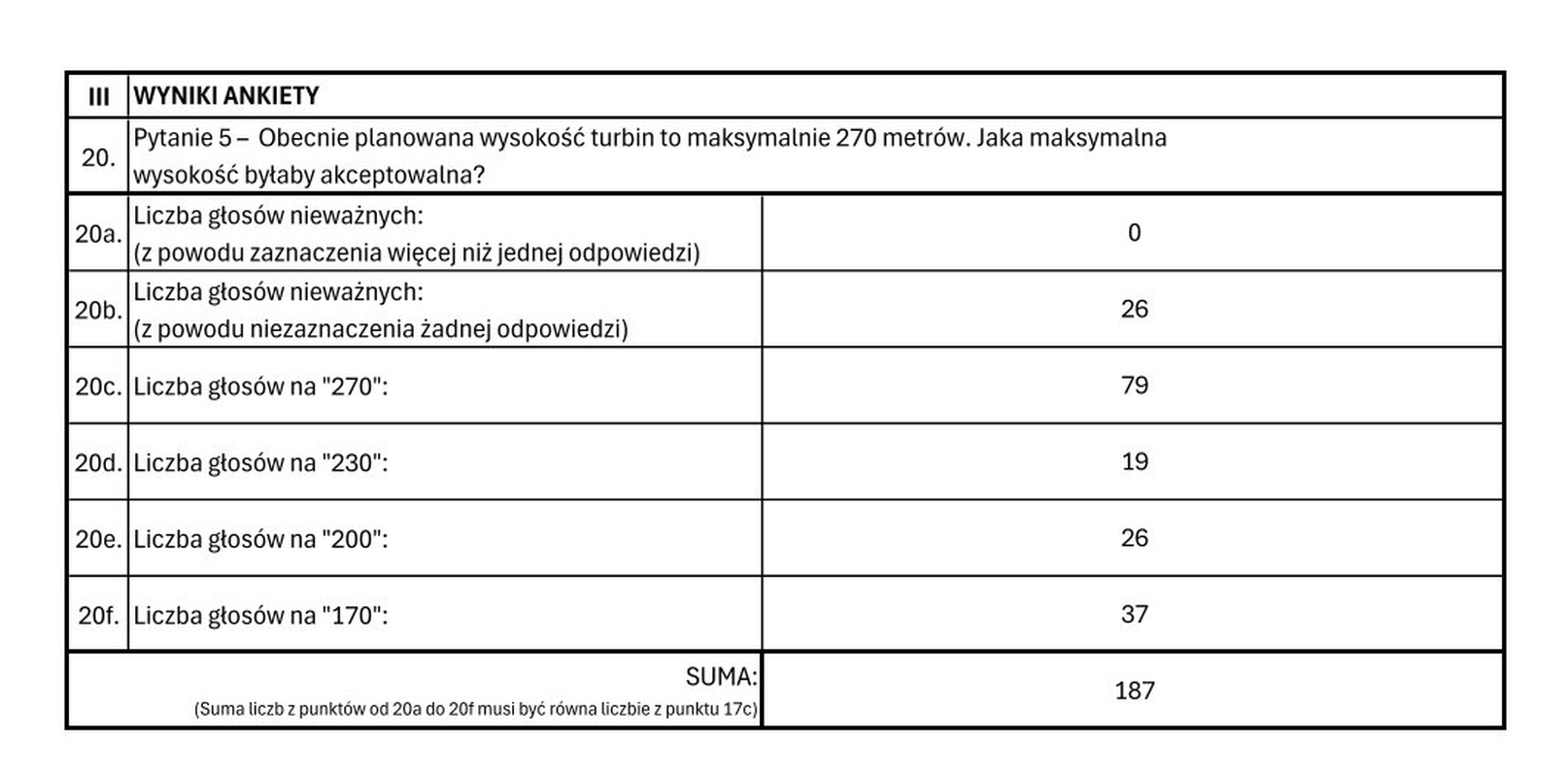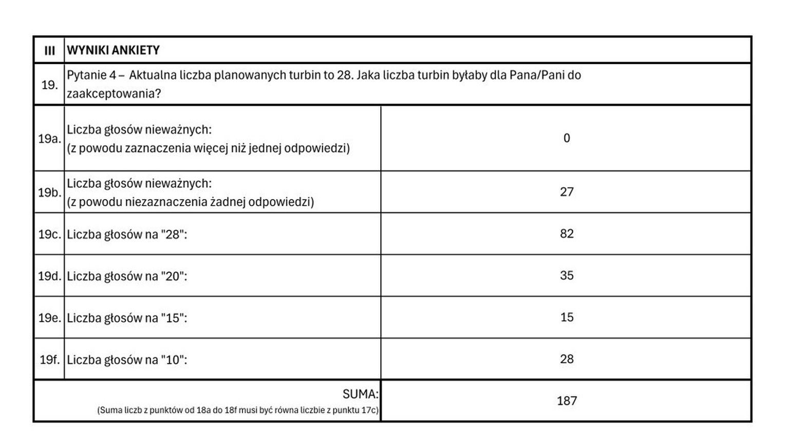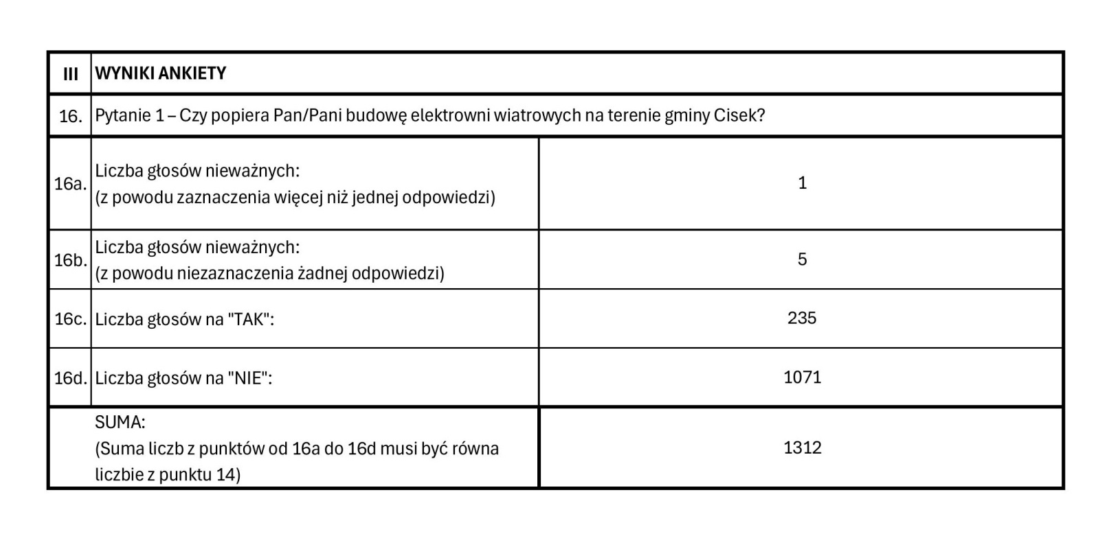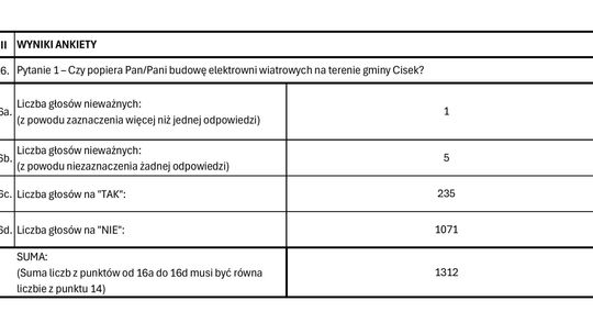 Mieszkańcy po raz kolejny wyrazili swój sprzeciw wobec inwestycji. W nieformalnym głosowaniu, przeprowadzonym za pomocą papierowej, anonimowej ankiety, udział wzięło 1312 osób. Aż 1071 z nich odpowiedziało „NIE” na kluczowe pytanie: "Czy popiera Pan/Pani budowę elektrowni wiatrowej na terenie gminy Cisek?".
