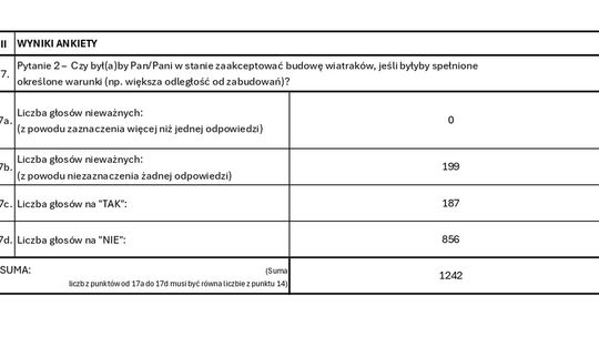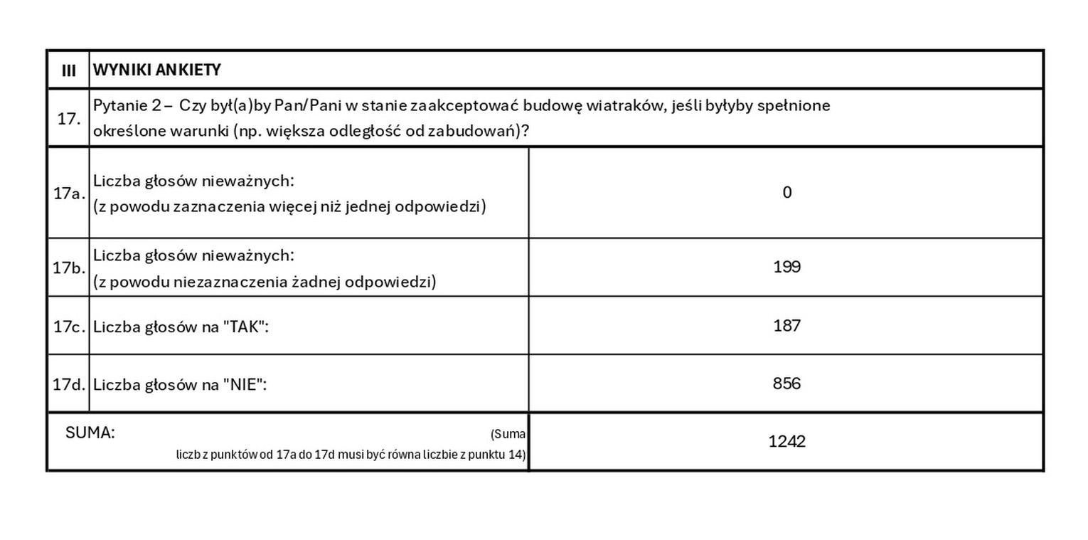 Warto dodać, że to kolejny wyraźny sygnał ze strony lokalnej społeczności. Już wcześniej mieszkańcy zgłaszali swoje zastrzeżenia w formie petycji, a temat farmy wiatrowej był obecny również podczas spotkań wiejskich i sesji rady gminy. Sprzeciw wobec lokalizacji turbin między domostwami wynika przede wszystkim z obaw o krajobraz, hałas oraz wpływ inwestycji na jakość życia i wartość nieruchomości.
