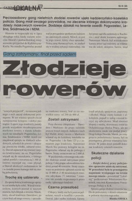 - Dzięki dobrej pracy policjantów- sprawców udało się zatrzymać. W przeszłości było to przestępstwo nagminnie występujące na terenie naszego miasta - powiedział “Lokalnej” podkomisarz Włodzimierz Kominek, rzecznik Komendanta Powiatowego Policji w K-K. Sprawa gangu złodziei rowerów trafiła do prokuratury z aktami oskarżenia w połowie stycznia tego roku.