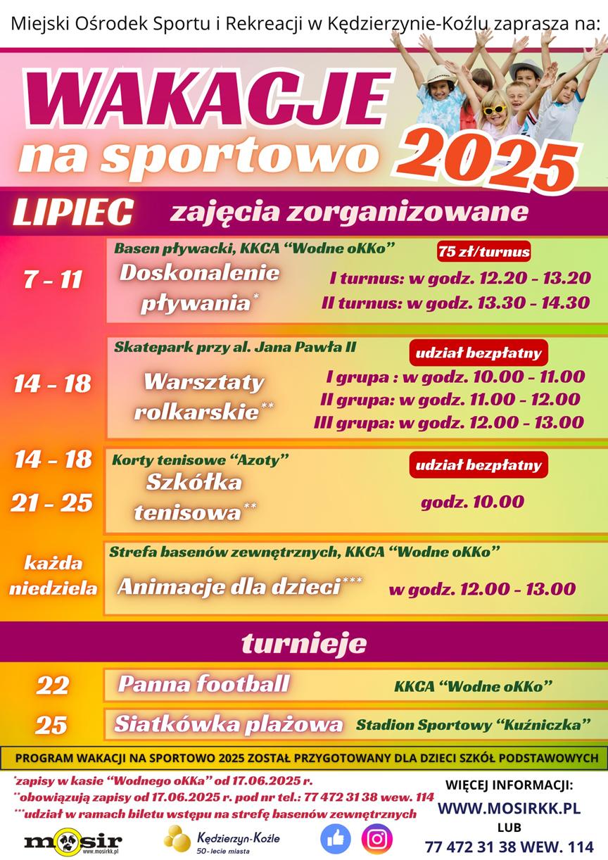 Miejski Ośrodek Sportu i Rekreacji w Kędzierzynie-Koźlu, jak co roku przygotował bogaty program zajęć dla dzieci i młodzieży, które chcą aktywnie spędzić wolny czas. Program zajęć zaplanowanych w lipcu znajduje się na plakacie poniżej.