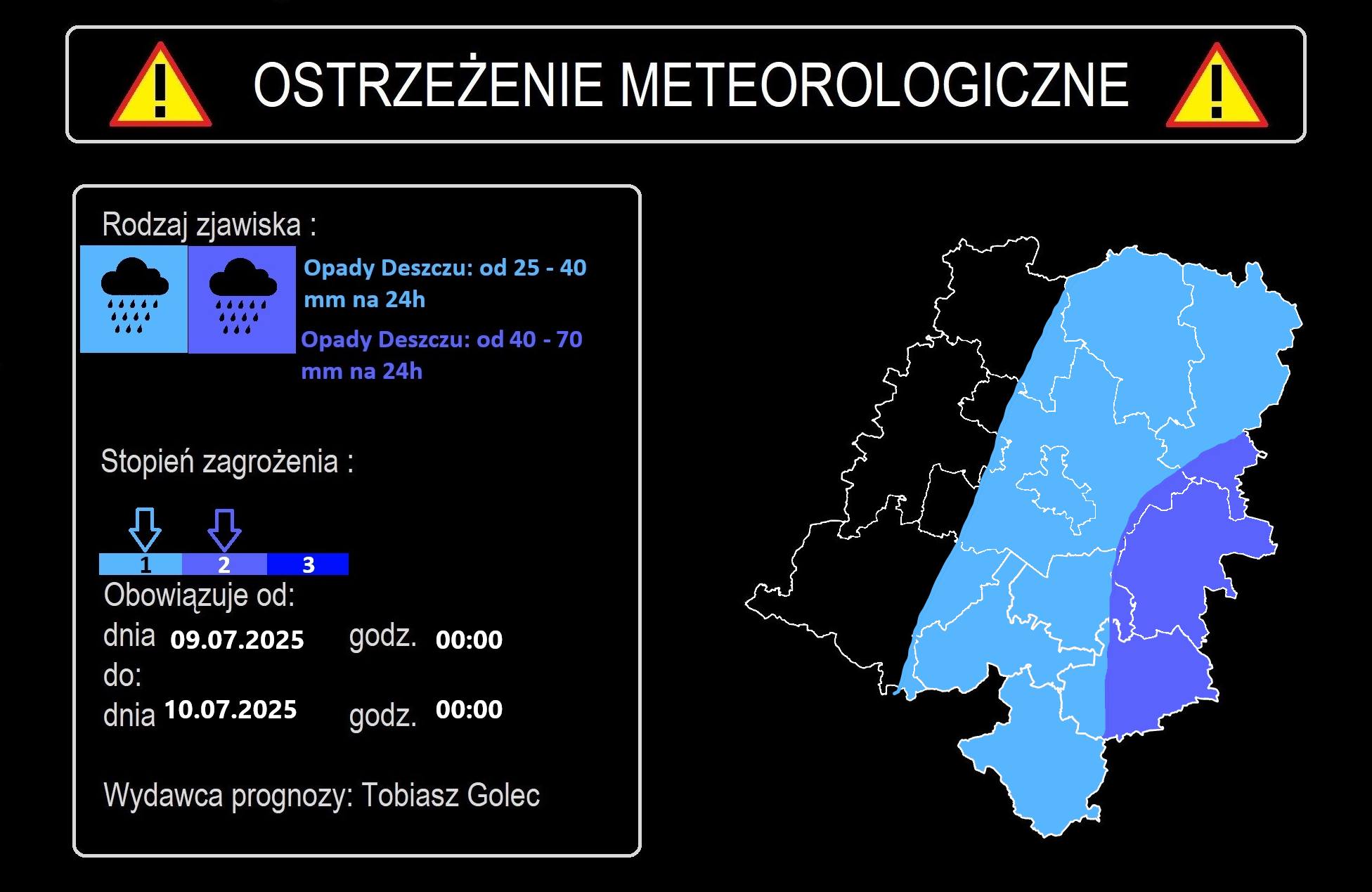 Najintensywniejsze opady od dziś (08.07) południa do jutra (09.07) do godziny 10:00. Na pozostałym obszarze województwa spadnie od 60 do 80 mm deszczu.