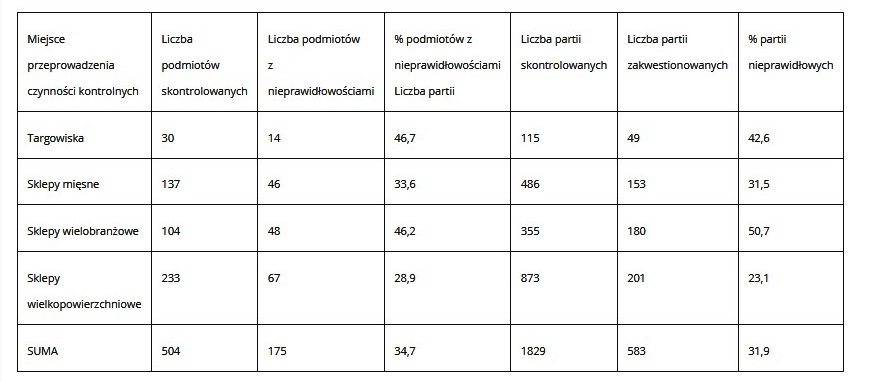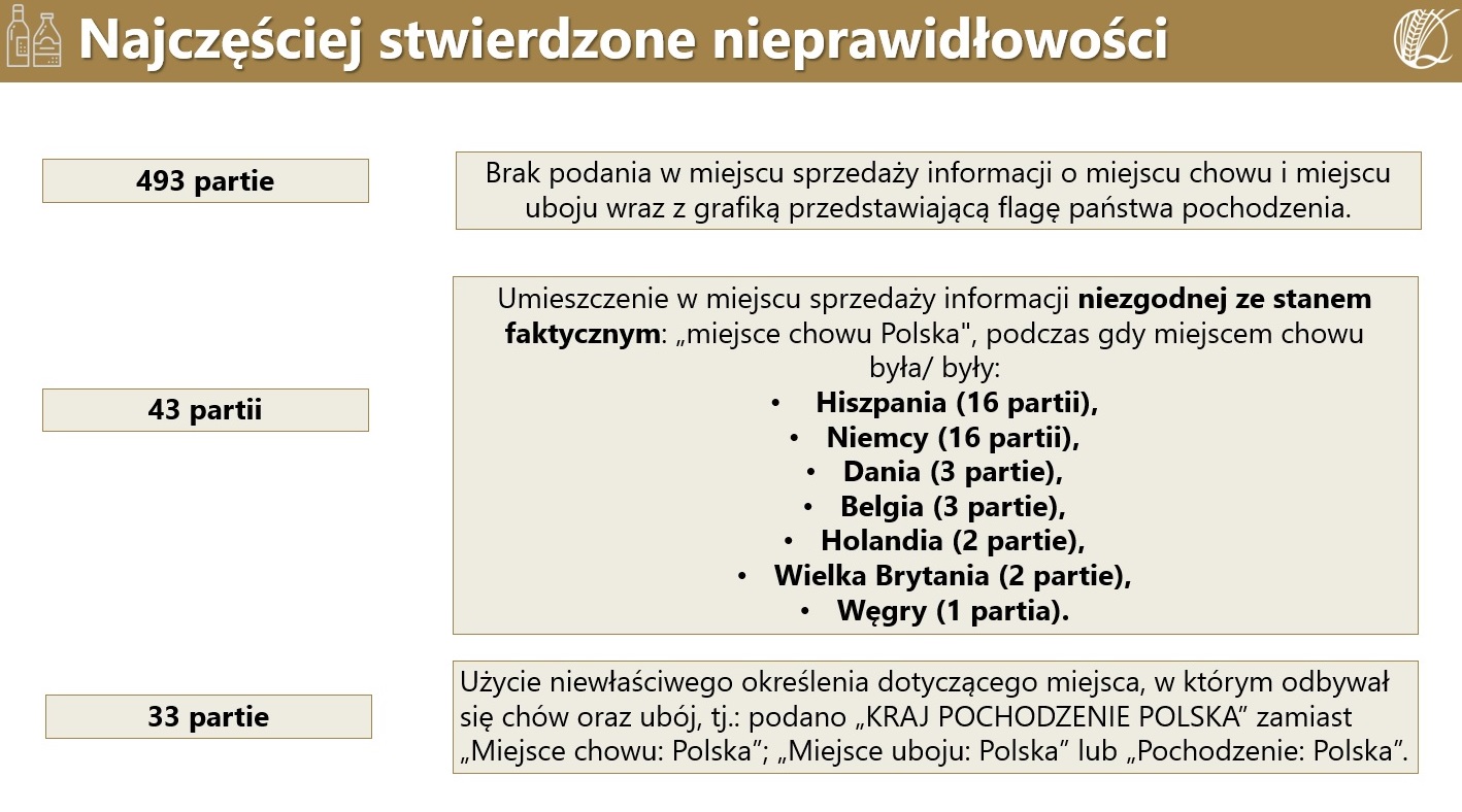 W przypadku 43 partii mięsa oznakowanego jako "polskie" co do miejsca chowu i uboju inspektorzy zidentyfikowali, że informacje przedstawione dla konsumenta były nieprawdziwe. Najwięcej przypadków dotyczyło fałszowania informacji o pochodzeniu mięsa