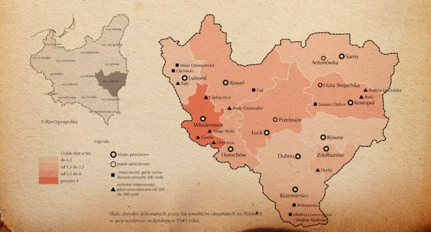 W latach 1943–1945 na Wołyniu i w Małopolsce Wschodniej ukraińscy nacjonaliści wymordowali według różnych źródeł od 80 do 120 tys. Polaków. Precyzyjna liczba ofiar nie jest możliwa do ustalenia. Celem zbrodniarzy z Organizacji Ukraińskich Nacjonalistów (banderowców) i Ukraińskiej Powstańczej Armii było wyniszczenie polskiego żywiołu na terenach, które uznawali za ukraińskie. W konsekwencji planowego ludobójstwa kilkaset tysięcy Polaków, ratując się przed okrutnie zadawaną śmiercią, torturami i okaleczeniem, uciekło z tych terenów.