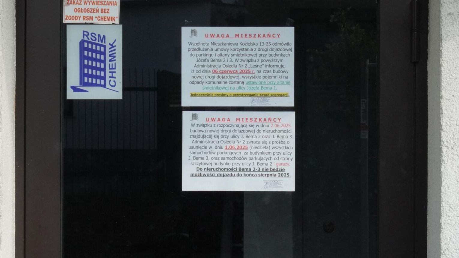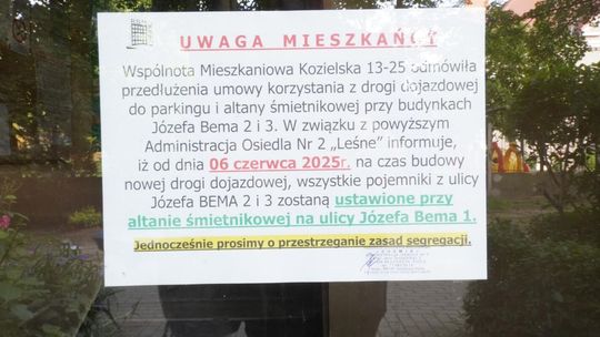 Pojawiamy się na miejscu. Na klatkach schodowych bloków przy ul. Józefa Bema natrafiamy na dwie informacje. Pierwsza z nich mówi: "Wspólnota Mieszkaniowa Kozielska 13-25 odmówiła przedłużenia umowy korzystania z drogi dojazdowej do parkingu i altany śmietnikowej przy budynkach Józefa Bema 2 i 3. W związku z powyższym Administracja Osiedla nr 2 "Leśne" informuje, iż od dnia 6 czerwca 2025 r., na czas budowy nowej drogi dojazdowej, wszystkie pojemniki na odpady komunalne zostaną ustawione przy altanie śmietnikowej na ulicy Józefa Bema 1. Jednocześnie prosimy o przestrzeganie zasad segregacji."