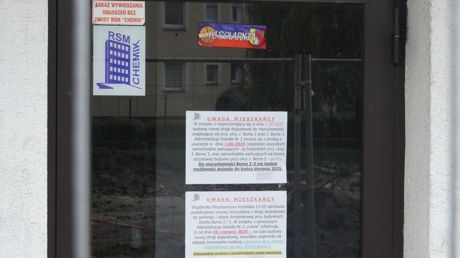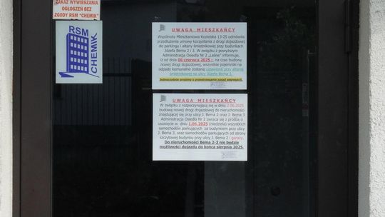 Z drugiej informacji można się dowiedzieć, że: "W związku z rozpoczynającą się w dniu 2.06.2025 budową nowej drogi dojazdowej do nieruchomości znajdujących się przy ulicy J. Bema 2 oraz J. Bema 3 Administracja Osiedla nr 2 zwraca się z prośbą o usunięcie w dniu 1.06.2025 (niedziela) wszystkich samochodów parkujących za budynkiem przy ulicy J. Bema 3, oraz samochodów parkujących od strony szczytowej budynku przy ulicy J. Bema 2 i garaży. Do nieruchomości Bema 2-3 nie będzie możliwości dojazdu do końca sierpnia 2025".