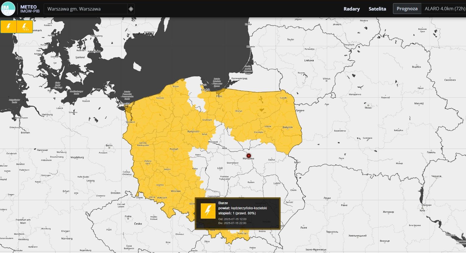 Instytut Meteorologii i Gospodarki Wodnej wydał żółte ostrzeżenie dla powiatu kędzierzyńsko-kozielskiego dotyczące burz z piorunami, które mogą wystąpić 15 lipca w godzinach 12:00-22:00. Prognozowane są gwałtowne opady deszczu do 35 mm, porywy wiatru do 80 km/h oraz lokalne opady drobnego gradu.