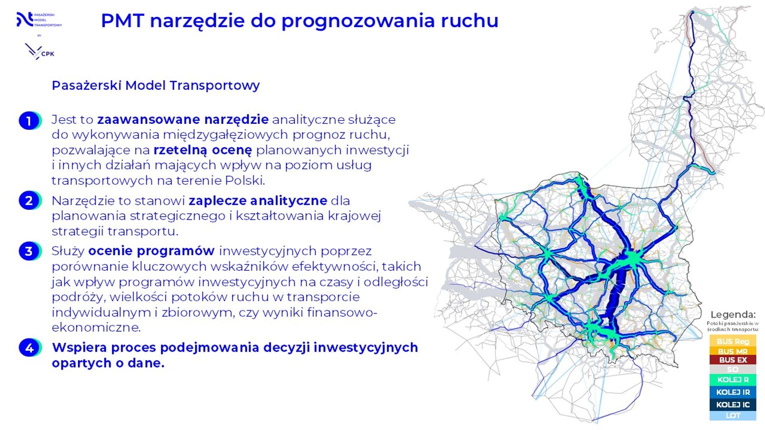 W 2035 r. na odcinku Warszawa – lotnisko CPK przewiduje się ponad 70 tys. pasażerów na dobę, a między CPK a Łodzią – prawie 60 tys. To największa dotąd aktualizacja Pasażerskiego Modelu Transportowego – narzędzia analitycznego służącego do prognozowania ruchu z uwzględnieniem różnych środków transportu. W nowym modelu PMT uwzględniono również Litwę, Łotwę i Estonię, co pozwala lepiej odwzorować wpływ projektu Rail Baltica na ruch kolejowy w Polsce. Model ten został także rozbudowany o 11 lotnisk zagranicznych.