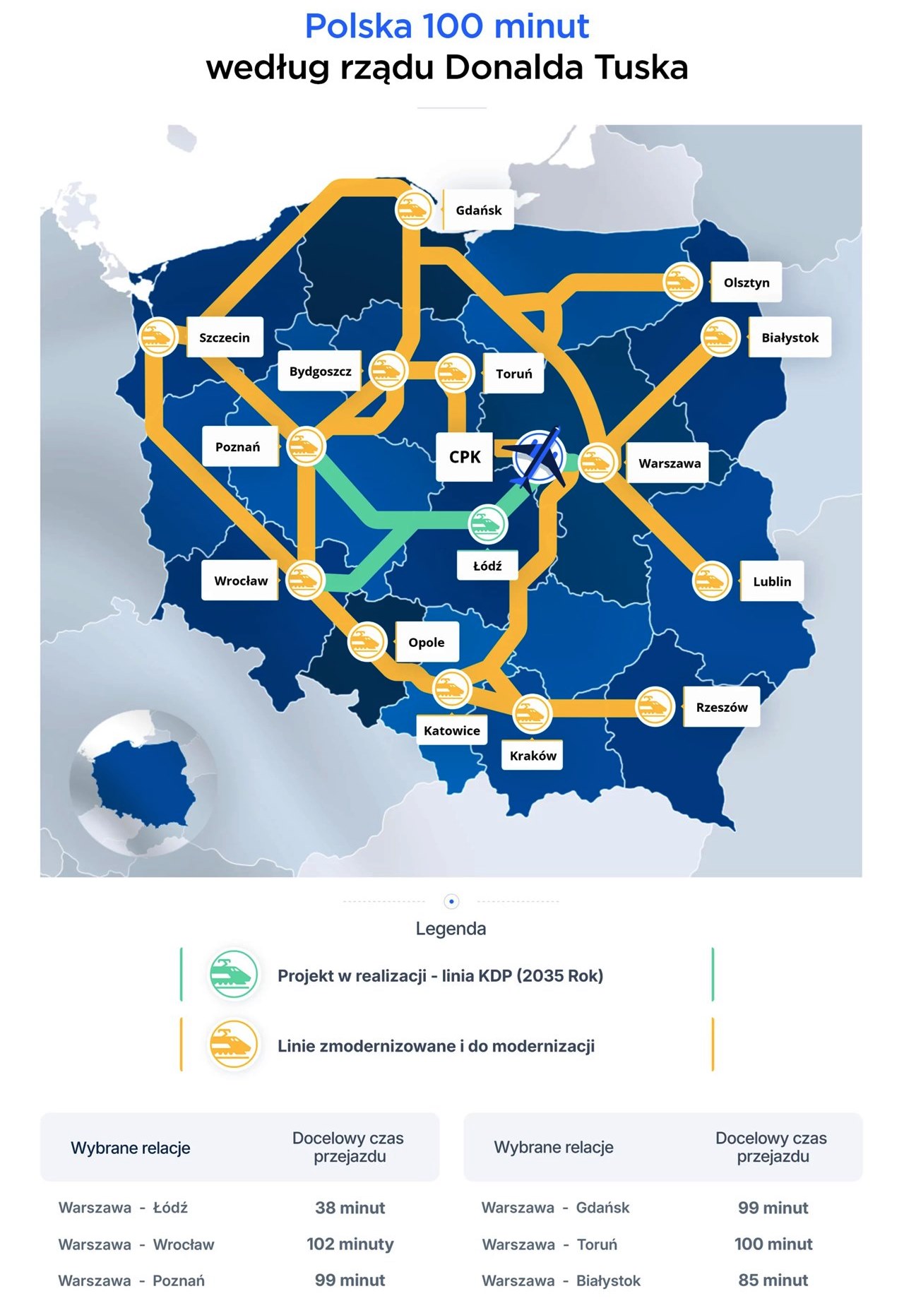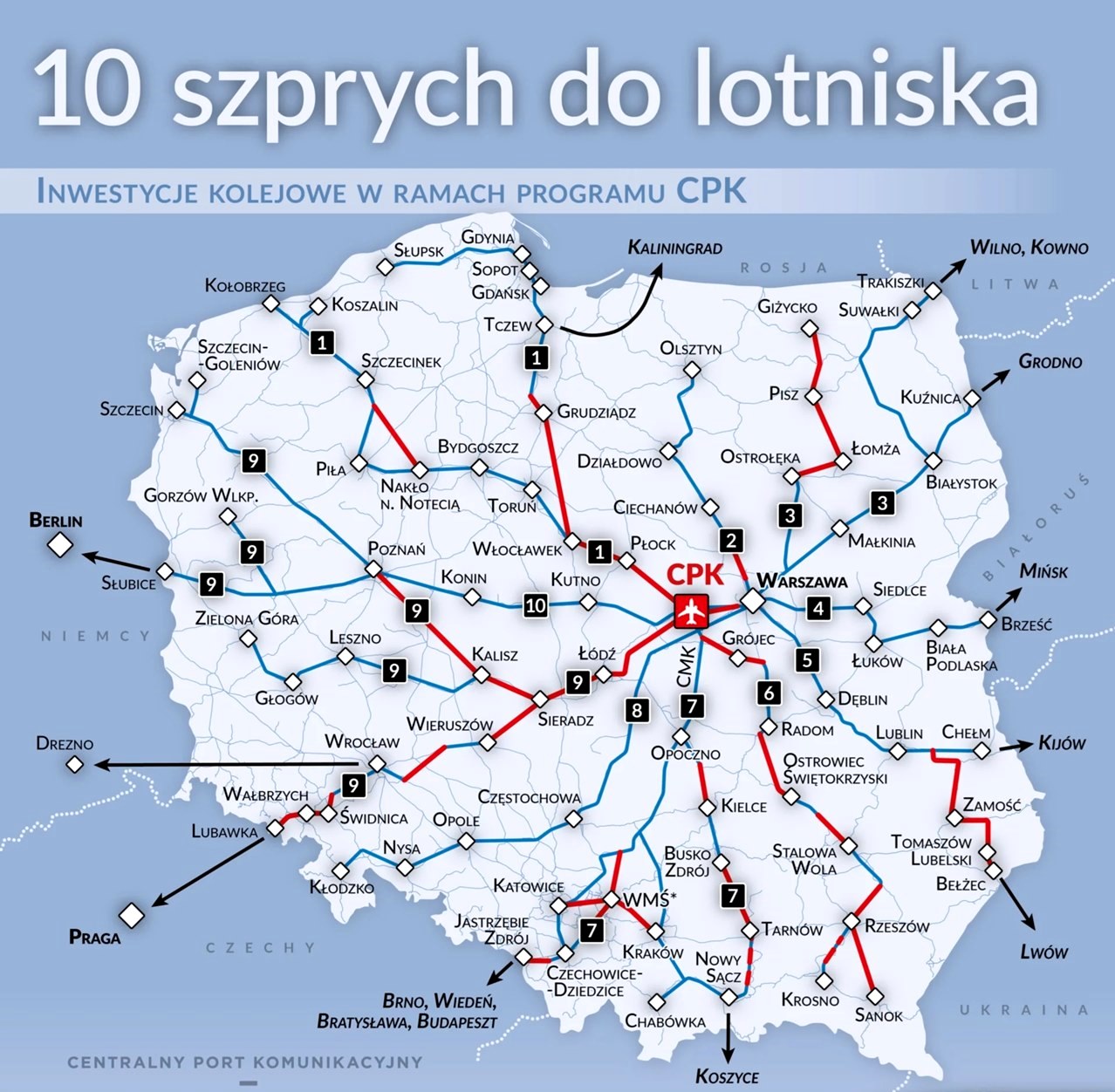 Nieco ponad rok temu CPK poinformowało, że rezygnuje z planu budowy linii zbiegających się promieniście w porcie w Baranowie. Zdecydowano o pozostawieniu tzw. „igreka”, a większość tras ma być wyznaczona od nowa. W artykule w Interii z 5 lipca br. można przeczytać m.in.: "Jak słyszeliśmy na konferencji Donalda Tuska, igrek na odcinku między stolicą a Łodzią ma zostać otwarty w 2032 roku, razem z leżącym na jego trasie lotniskiem. W kolejnych latach KDP ma dotrzeć do wspomnianych Poznania oraz Wrocławia, a w dalszej, bo sięgającej 2040 roku perspektywie, Centralna Magistrala Kolejowa (dziś łącząca Mazowsze ze Śląskiem i Małopolską - red.) zostałaby wydłużona do Trójmiasta. Nazwa Polska 100 minut natomiast ma symbolizować to, że w przyszłości między Warszawą a innymi aglomeracjami przedostaniemy się maksymalnie właśnie w takim czasie".