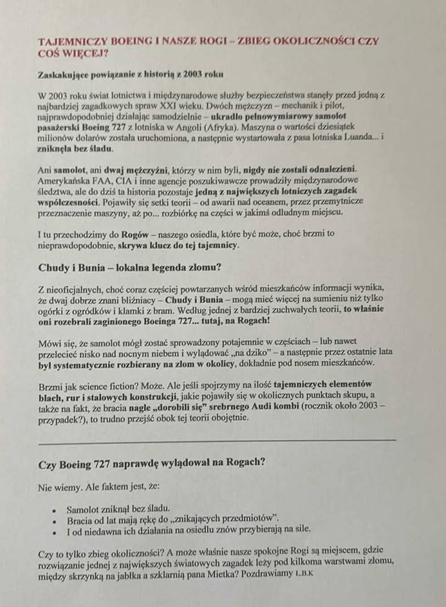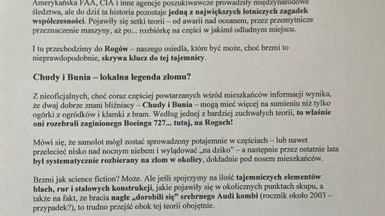 No cóż, wakacje to czas sprzyjający różnym, mniej lub bardziej sensacyjnym historyjkom. W przeszłości cała Polska żyła na przykład opowieściami o potworze Paskuda z Zalewu Zegrzyńskiego. W tym przypadku mamy prawdziwą historię o zaginionym samolocie. Do zdarzenia doszło 25 maja 2003 roku na lotnisku w Luandzie (Angola). Dwóch mężczyzn (mechanik i pilot) prawdopodobnie ukradło porzuconego Boeinga 727-223 (numer rejestracyjny N844AA). Samolot wystartował bez zgody wieży, nie utrzymywał kontaktu radiowego i zniknął z radarów. Do dziś: samolot, jak i mężczyźni, nigdy nie zostali odnalezieni. Zdarzenie uznaje się za jedną z największych lotniczych zagadek XXI wieku. Sporo informacji na ten temat można znaleźć w internecie. Autor tekstu o Rogach tworzy lub powiela lokalną legendę w konwencji kryminalnej sensacji. Z przymrużeniem oka sugeruje, że zaginiony Boeing mógł trafić do naszego miasta, gdzie został rozebrany na złom. Całość to żartobliwe, ale sprytnie napisane połączenie prawdziwej zagadki lotniczej ze zmyśloną opowieścią. Nie ma żadnych dowodów na to, że zaginiony Boeing trafił do Rogów. No chyba, że któryś z naszych Czytelników ma inne zdanie, więc zapraszamy do komentowania.