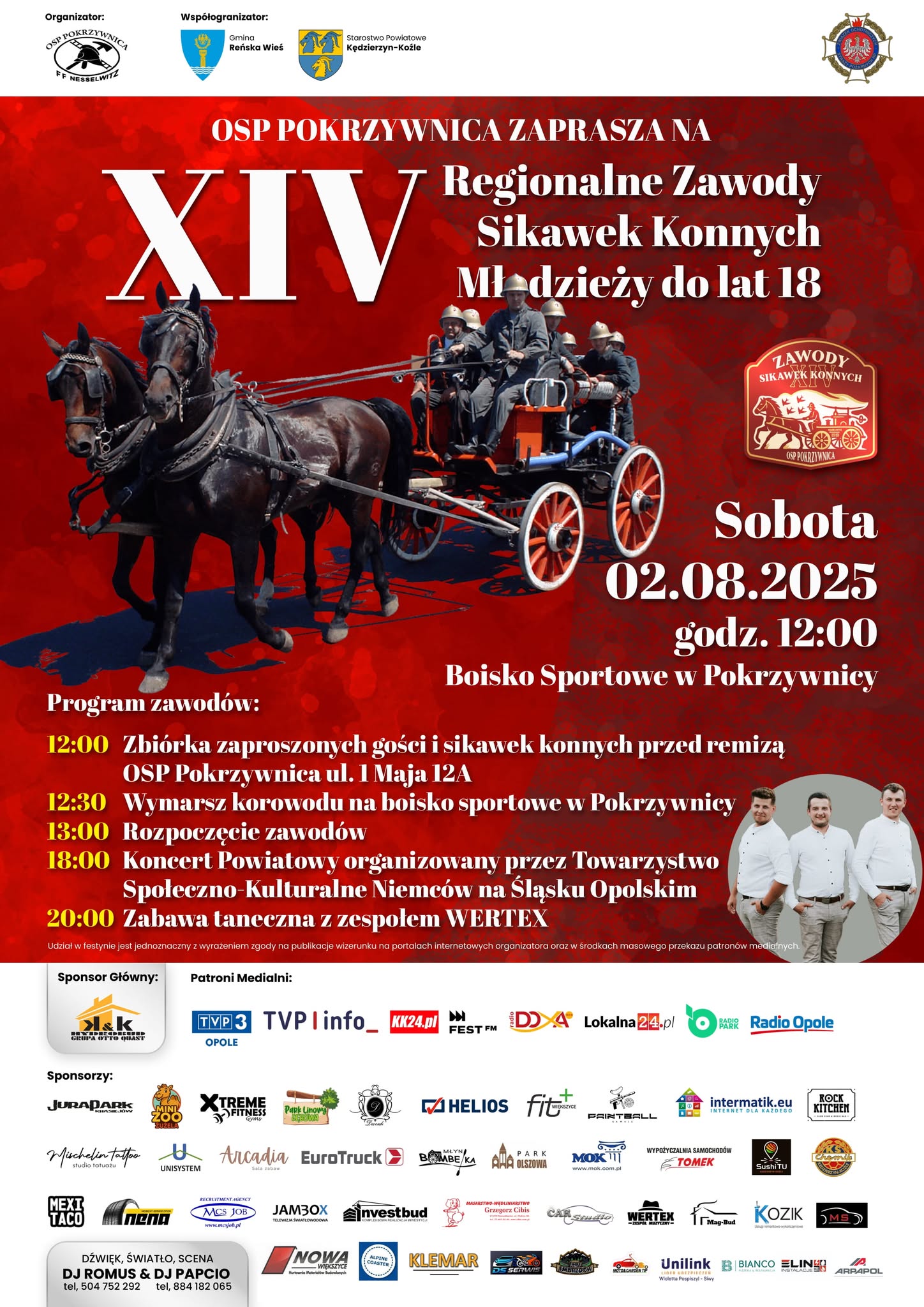 Tegoroczne zawody rozpoczną się o godzinie 12:00 zbiórką zaproszonych gości oraz drużyn i sikawek konnych przed remizą OSP Pokrzywnica. O 12:30 barwny korowód wyruszy w kierunku boiska sportowego, gdzie o 13:00 nastąpi oficjalne otwarcie wydarzenia i rozpoczęcie rywalizacji młodzieżowych drużyn strażackich. O godzinie 18:00 zaplanowano koncert powiatowy organizowany przez Towarzystwo Społeczno-Kulturalne Niemców na Śląsku Opolskim, a od 20:00 trwać będzie zabawa taneczna z zespołem WERTEX.