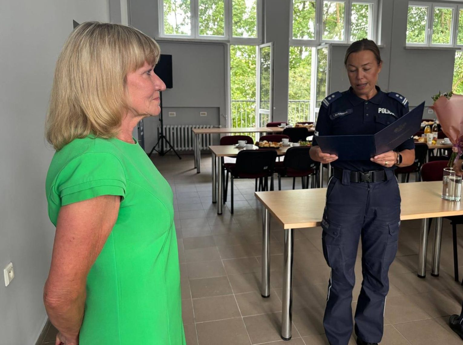 Podczas czwartkowej (31 lipca) uroczystości w sali konferencyjnej Komendant Powiatowy Policji, młodszy inspektor Iwona Żurawska, w obecności I Zastępcy Komendanta, młodszego inspektora Jarosława Bąka, funkcjonariuszy oraz pracowników cywilnych, podziękowała pani Jolancie za wieloletnią, sumienną i oddaną służbę.