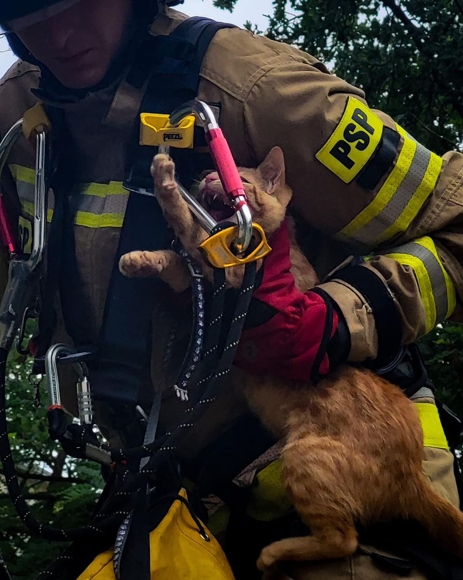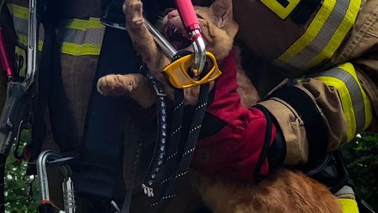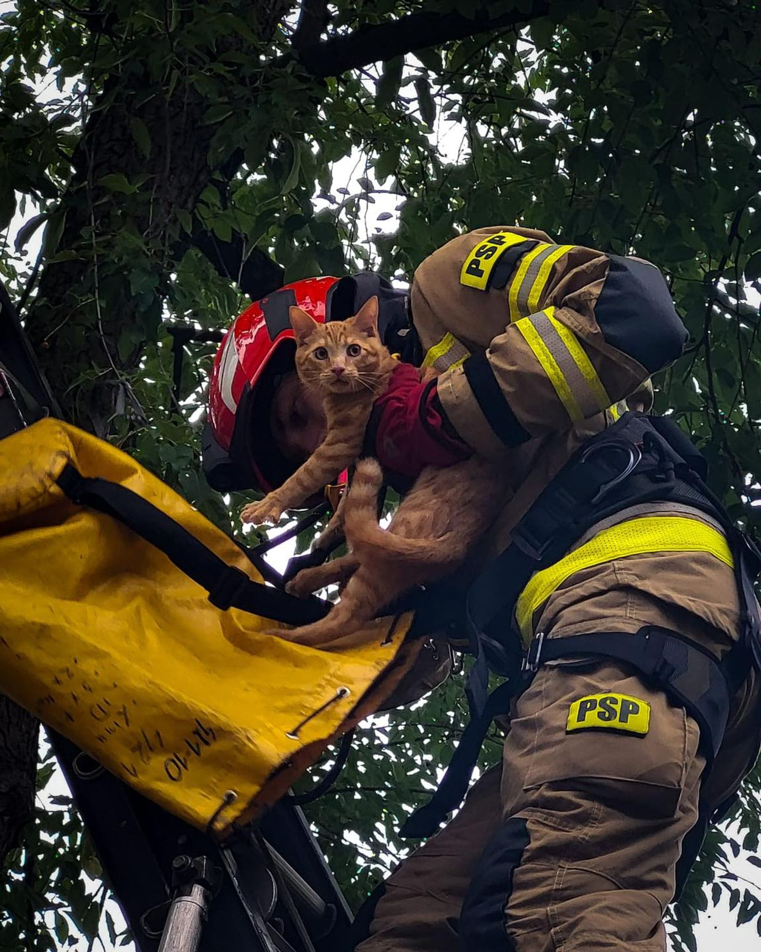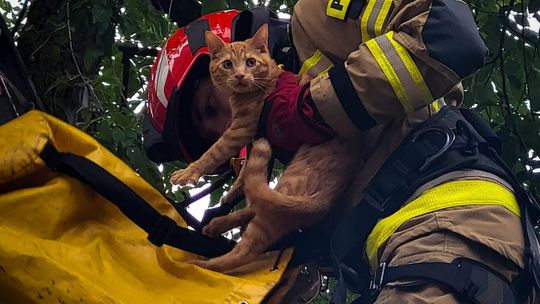 Dzięki szybkiej reakcji i sprawnemu działaniu, zwierzak został bezpiecznie sprowadzony na ziemię i przekazany właścicielowi. Wielkie brawa dla strażaków za opanowanie, empatię i profesjonalizm – nawet w takich sytuacjach! Kotek cały, zdrowy i już odpoczywa po swojej przygodzie.