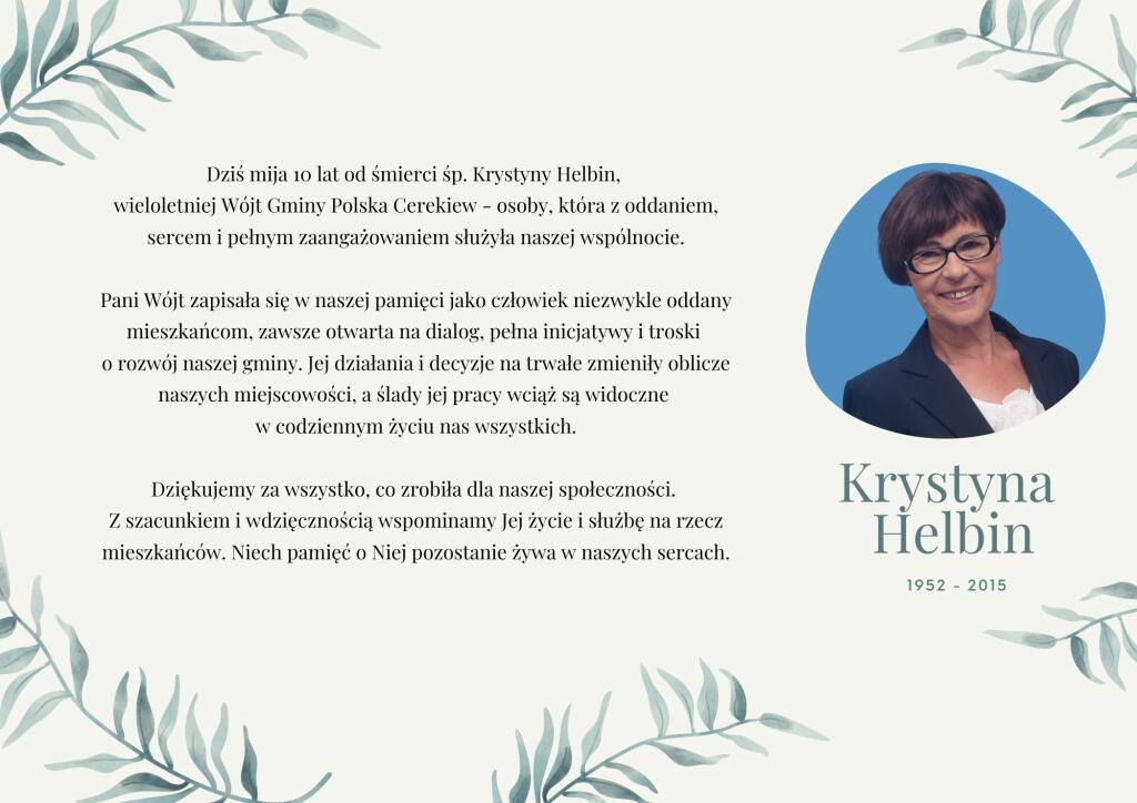 Dziesięć lat temu, 7 sierpnia 2015 roku, w wieku 63 lat zmarła Krystyna Helbin - postać szczególnie zasłużona dla gminy Polska Cerekiew. Z tej okazji władze samorządowe przypomniały mieszkańcom o jej dorobku i wkładzie w rozwój lokalnej wspólnoty.