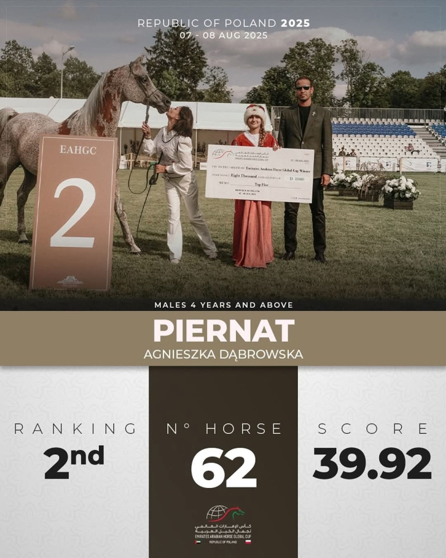 Największe emocje pojawiły się w półfinale, gdy Piernat zajął drugie miejsce w stawce ośmiu najlepszych koni arabskich polskich hodowli. W wielkim finale para uplasowała się na trzeciej pozycji, ustępując jedynie koniom o światowych tytułach i bogatym doświadczeniu.