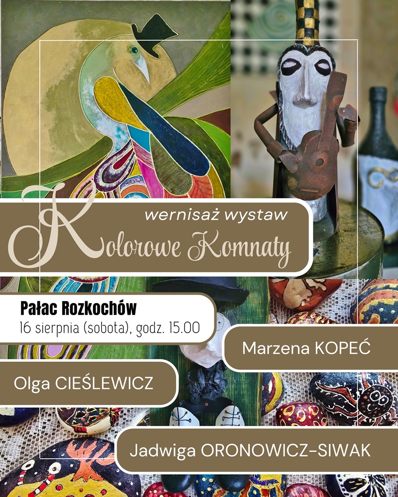 Z kolei dzień wcześniej, 16 sierpnia, o godz. 15.00 w pałacu przy ul. Głogowskiej 1 nastąpi otwarcie wystawy pt. "Kolorowe komnaty", której autorkami są artystki z Kędzierzyna-Koźla: Olga Cieśliewicz, Marzena Kopeć i Jadwiga Oronowicz-Siwak. Wstęp wolny.