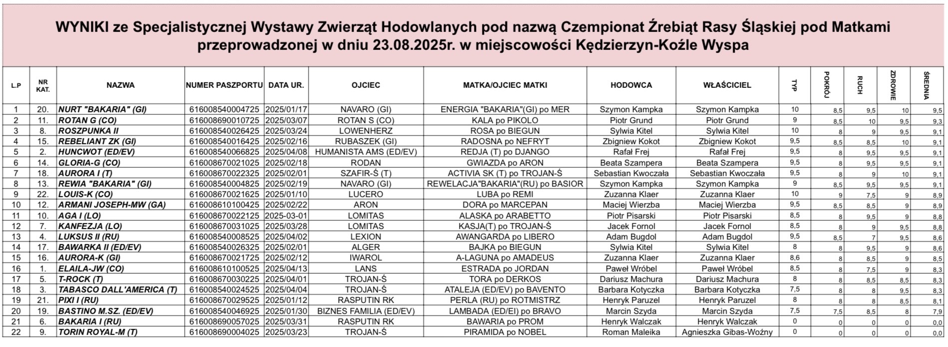 Tytuł CZEMPIONA wywalczył ogierek NURT ”BAKARIA” (Navaro(GI)/ Energia „BAKARIA” po Mer) uzyskując imponujący wynik końcowy 9,5 pkt. Hodowcą i właścicielem zwycięzcy jest Szymon Kampka z miejscowości Kornowac w województwie śląskim. Wszystkie źrebięta były znakomicie przygotowane, prezentując doskonałą kondycję oraz potencjał hodowlany i użytkowy. Wydarzenie potwierdziło wysoką jakość koni rasy śląskiej w regionie oraz zaangażowanie hodowców w dalszy rozwój tej niezwykle cennej populacji - podsumowuje dyrektor Śląsko-Opolskiego Związku Hodowców Koni, Nicola Patucha.