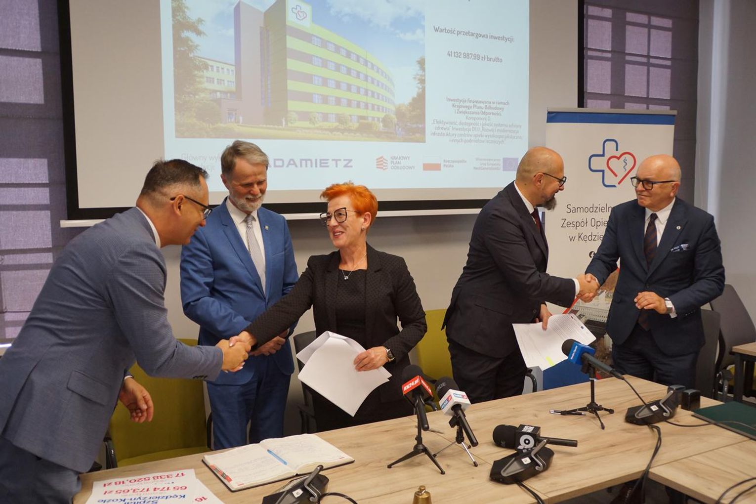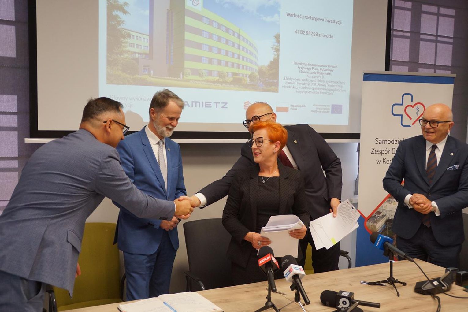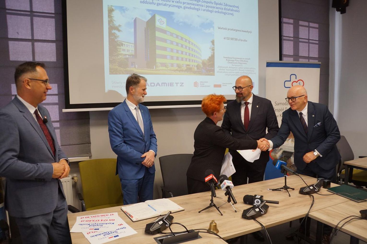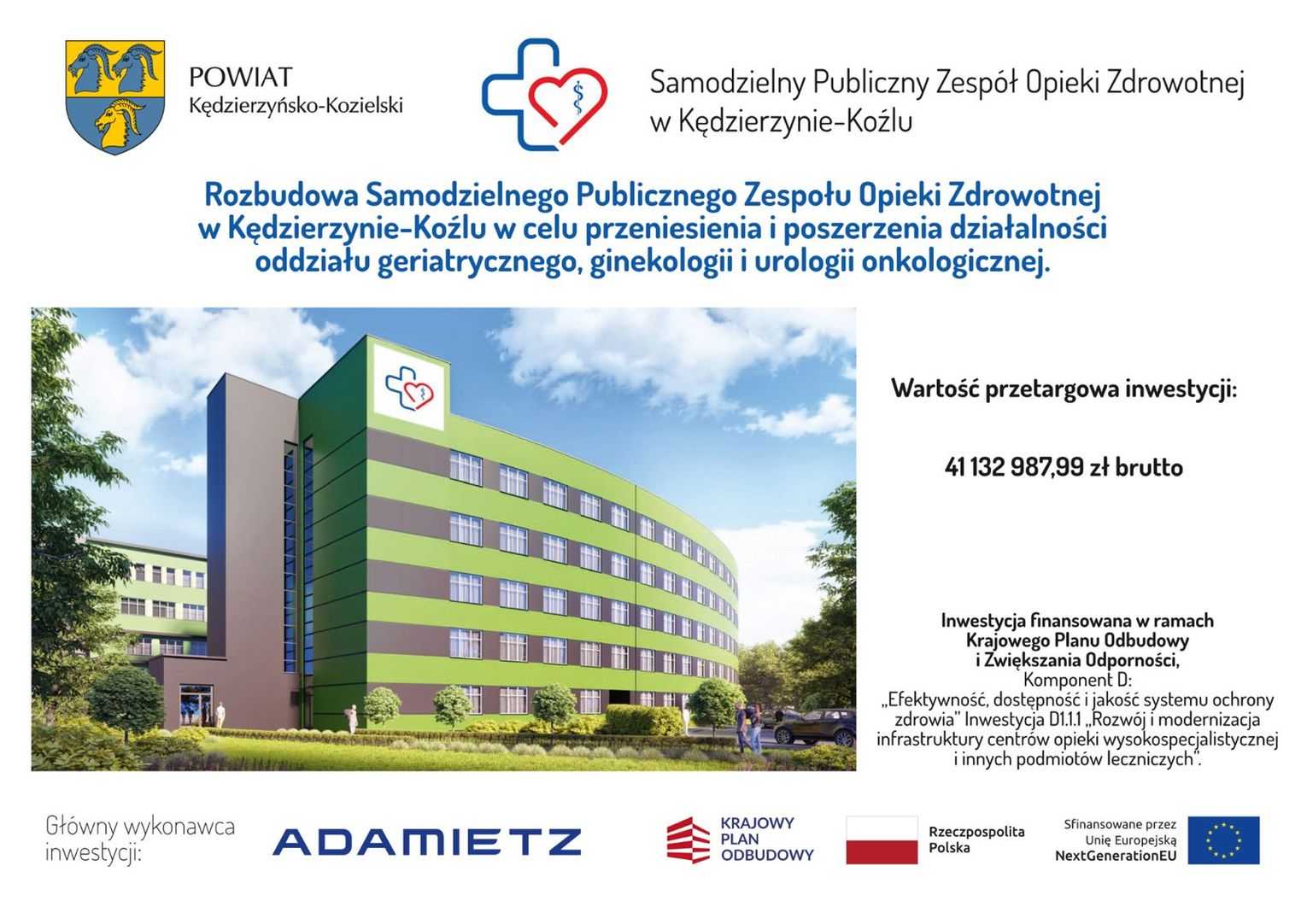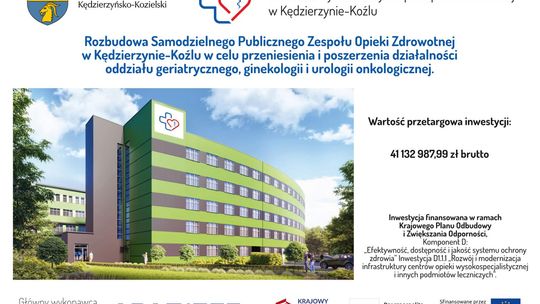 Natomiast 26 sierpnia w starostwie powiatowym w Kędzierzynie-Koźlu podpisano umowę na rozbudowę jednego z budynków SP ZOZ w celu przeniesienia i poszerzenia działalności oddziałów: geriatrii, ginekologii i urologii onkologicznej. Najkorzystniejszą ofertę w przetargu złożyła firma Adamietz Sp. z o. o. ze Strzelec Opolskich, która zrealizuje zadanie za 41 132 987,99 złotych brutto. Projekt jest finansowany ze środków Krajowego Planu Odbudowy (KPO).
