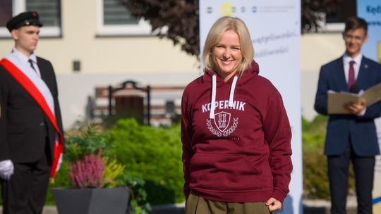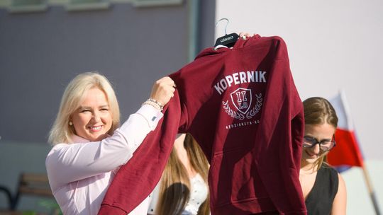 Nowa pani dyrektor została symbolicznie przyjęta do szkolnej społeczności "Kopernika" wręczeniem firmowej bluzy.