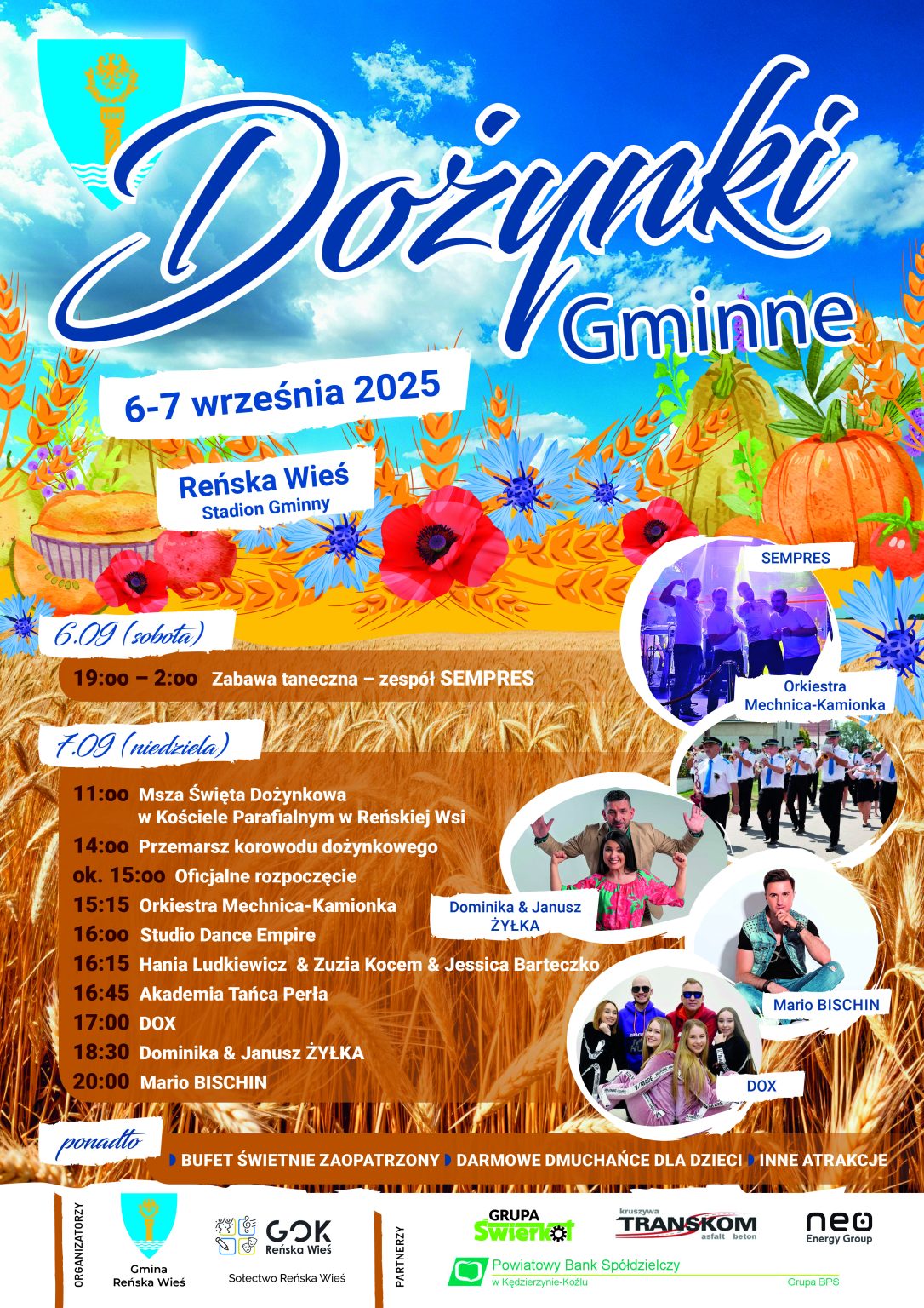W niedzielę 7 września uroczystości rozpoczną się Mszą Świętą Dożynkową o godzinie 11:00 w Kościele Parafialnym w Reńskiej Wsi, po czym o 14:00 nastąpi przemarsz korowodu dożynkowego na stadion. Oficjalne rozpoczęcie imprezy przewidziano około godziny 15:00, a następnie publiczność będzie mogła podziwiać występy artystyczne: Orkiestrę Mechnica-Kamionka, Studio Dance Empire, Dominikę i Janusza Żyłków, Hanię Ludkiewicz, Zuzię Kocem i Jessicę Barteczko, Akademię Tańca Perła oraz zespół DOX. Wieczór zakończy koncert Mario Bischina o godzinie 20:00.