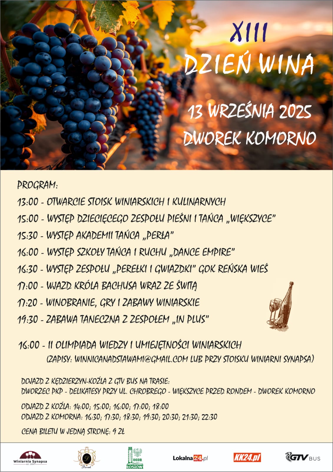 Szczegółowy program XIII Dnia Wina oraz dokładne godziny odjazdu autobusów w obie strony, znajdziecie na poniższym plakacie.