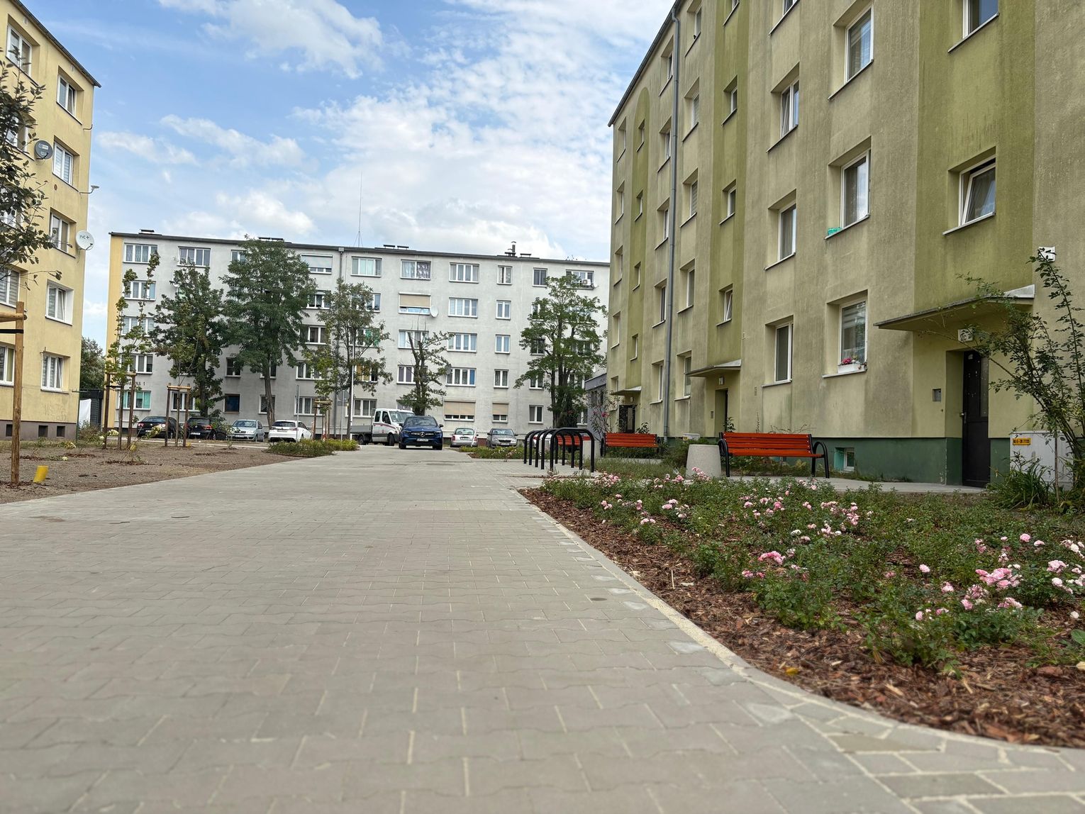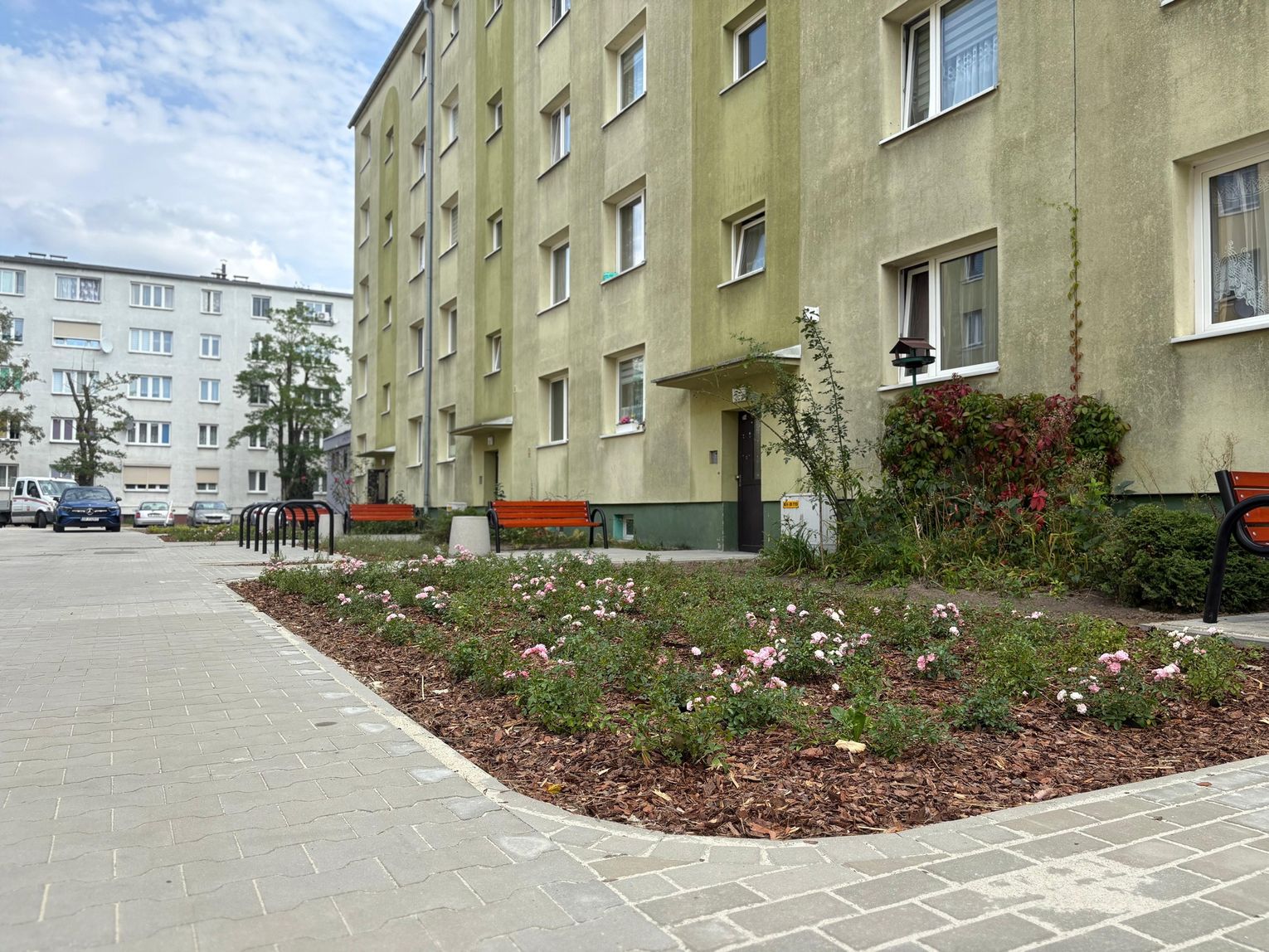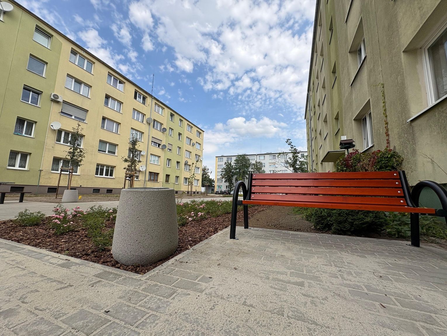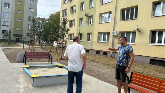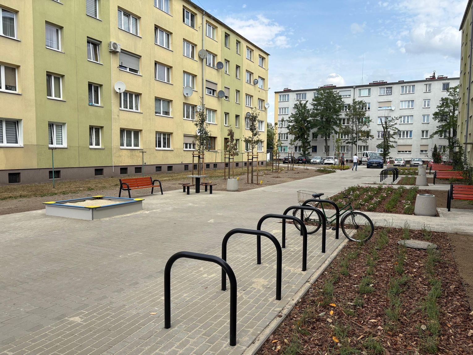Pojawiły się także nowe nasadzenia zieleni oraz elementy małej architektury. Ławki, kosze na śmieci, stojaki na rowery, piaskownica i stół do gry w szachy tworzą idealne miejsce do odpoczynku, zabawy i sąsiedzkiej integracji.