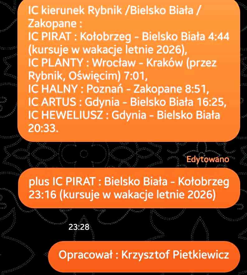 - Trochę to dla mnie niezrozumiałe, że wspomniany TLK PIRAT z Bielska Białej do Kołobrzegu będzie jeździł tylko w wakacje, ponieważ pierwotnie miał być całoroczny - zastanawia się Krzysztof Pietkiewicz.