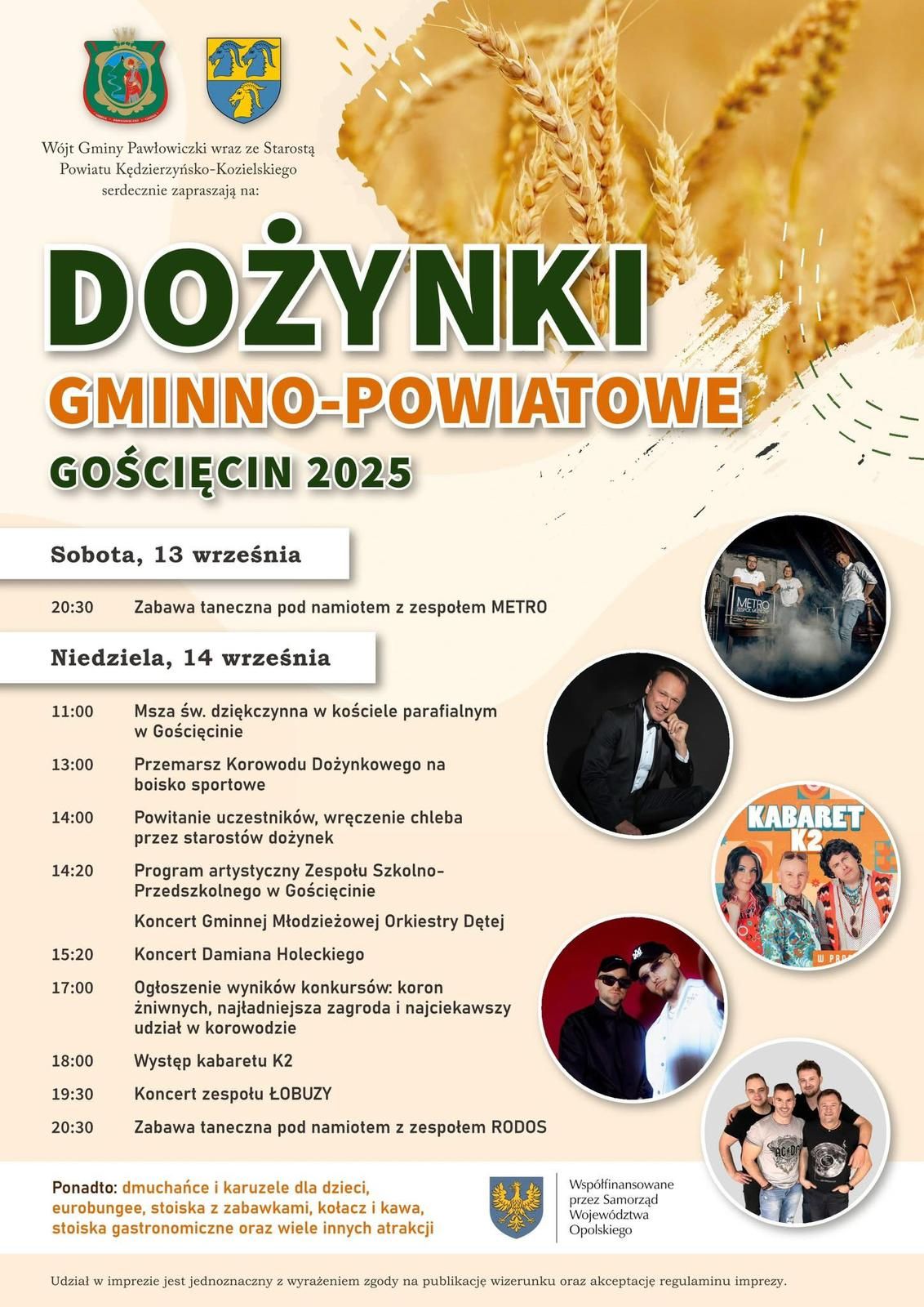 Na scenie nie zabraknie lokalnych akcentów - wystąpi Zespół Szkolno-Przedszkolny z Gościęcina oraz Gminna Młodzieżowa Orkiestra Dęta. W części koncertowej zaprezentuje się Damian Holecki. W dalszej części wydarzenia ogłoszone zostaną wyniki konkursów na najpiękniejsze korony żniwne, zagrody i wieńce. Publiczność rozbawi kabaret K2, a następnie usłyszymy energetyczny występ zespołu Łobuzy. Zwieńczeniem dnia będzie zabawa taneczna pod namiotem z zespołem Rodos.