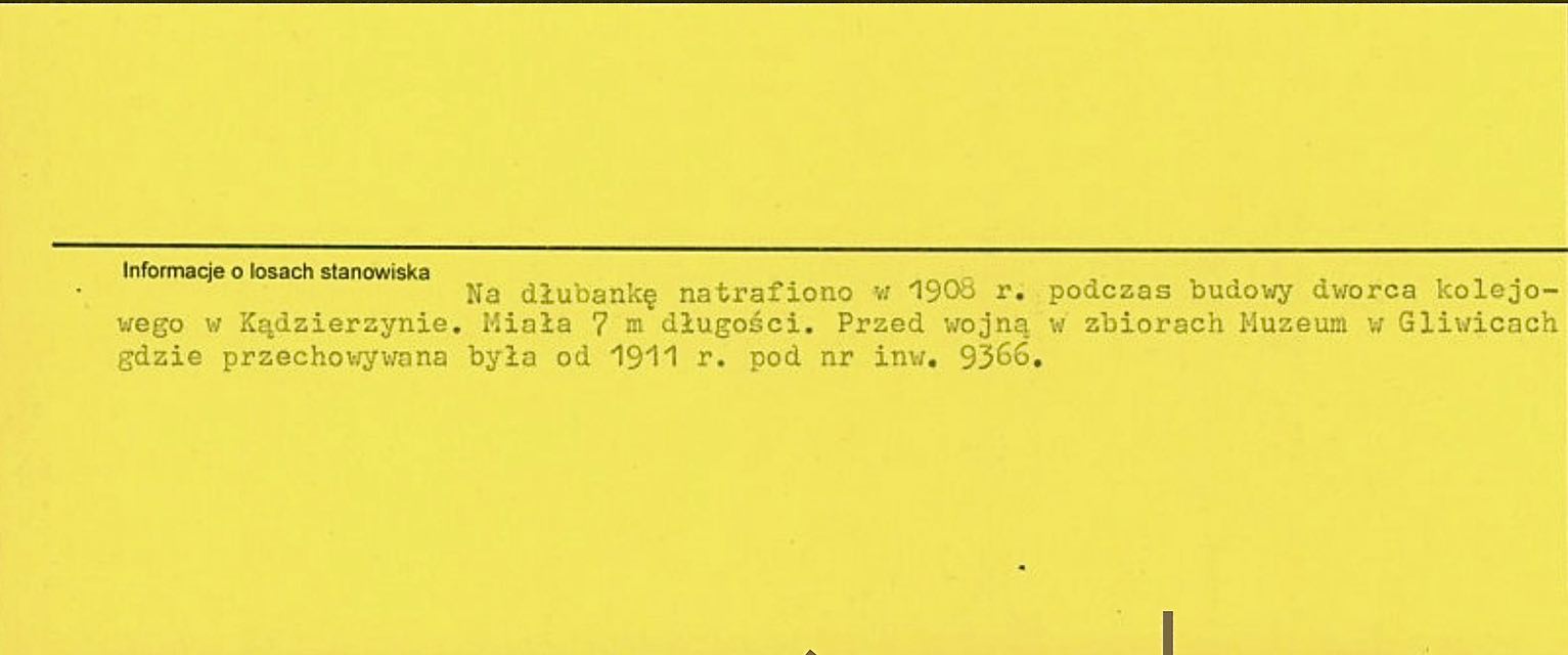 Jak ujawnia kanał historyczny Bunker King w dokumentach, czyli w karcie ewidencji stanowiska archeologicznego możemy przeczytać, że na dłubankę natrafiono w 1908 roku.