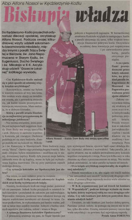 - Z pewnością orientuje się pani, że Śląsk Opolski jest jednym z bogatszych-regionów. W hierarchicznej strukturze Kościoła wygląda to następująco: każda z parafii utrzymuje się sama, tylko większe inwestycje finansowe pokrywa kuria. Oczywiście wcześniej dana inwestycja jest rozpatrywana i po zatwierdzeniu przez kurię, parafia otrzymuje pieniądze.