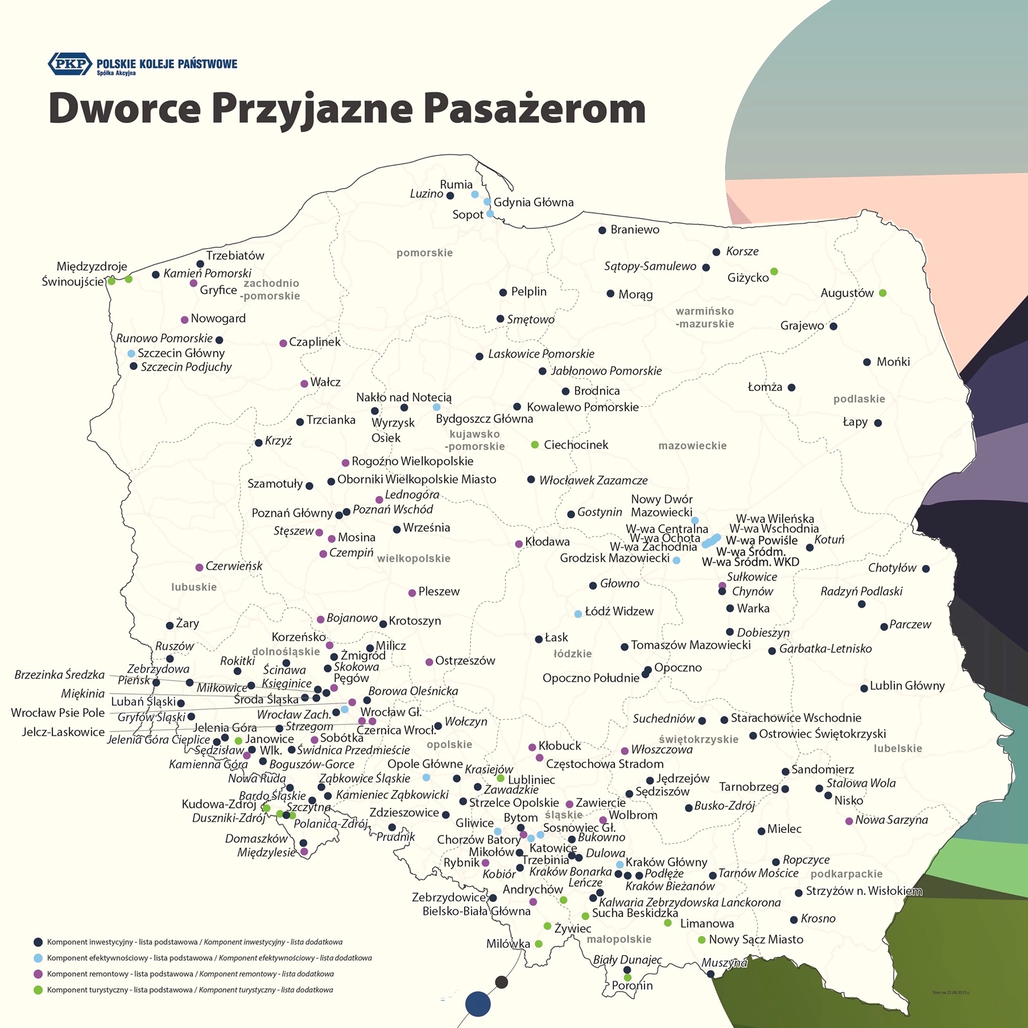 Komponent turystyczny: Nowością w planach inwestycyjnych są działania obejmujące unowocześnienie dworców mających duże znaczenie w obsłudze ruchu turystycznego, zwłaszcza w sezonach letnim i zimowym, z których korzystają również lokalni mieszkańcy. Na liście takich obiektów znalazły się m.in. dworce w południowej części Polski (Żywiec, Sucha Beskidzka, Limanowa)-, a także budynki w Augustowie, Międzyzdrojach czy Ciechocinku.