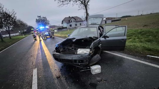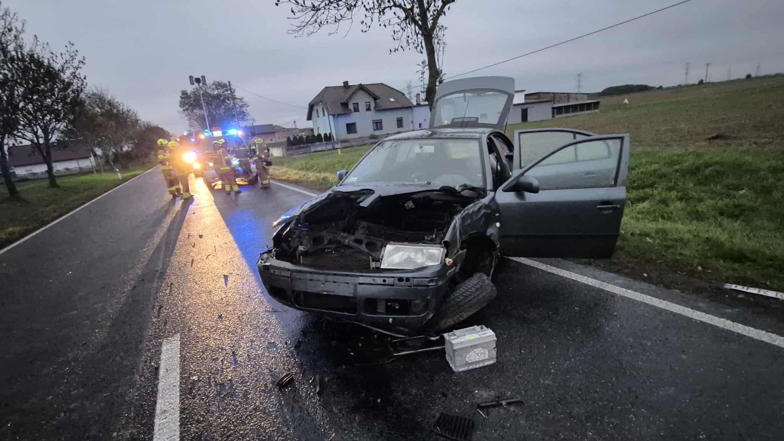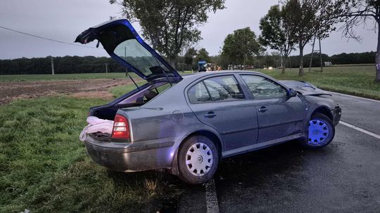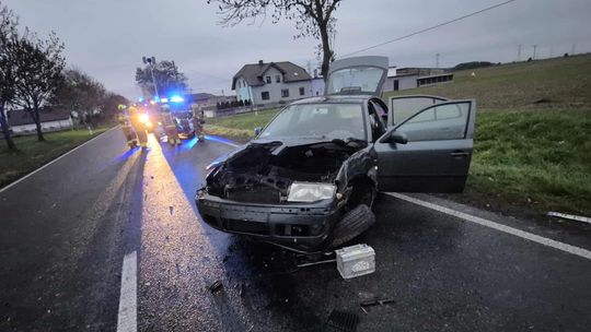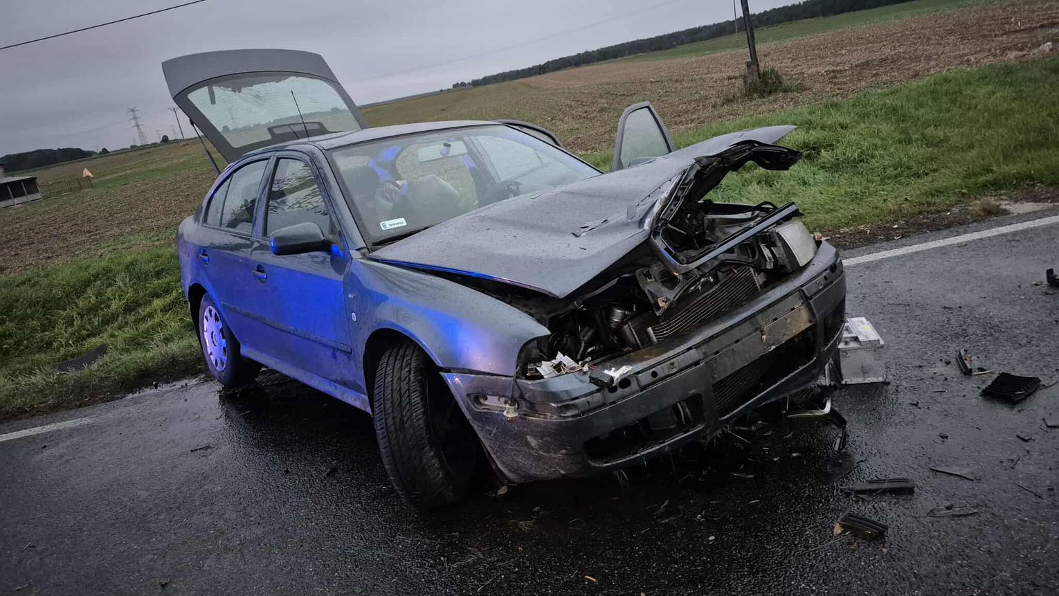 Samochód marki Skoda Octavia na prudnickich numerach rejestracyjnych jechał ulicą Kozielską od strony Twardawy na Większyce. Kierowca nie dostosował prędkości jazdy do panujących warunków, wypadł na łuku drogi i uderzył w przydrożne drzewo. Autem podróżowały dwie osoby oraz pies.