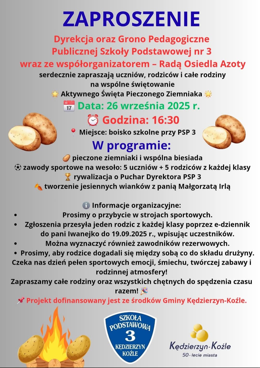 Obszerną relację ze swojego święta zamieściła Publiczna Szkoła Podstawowa nr 1 w Kędzierzynie-Koźlu. I choć prognozy nie były optymistyczne, a niebo nad głowami uczestników zasnuły ciemne chmury, to 4. Święto Pieczonego Ziemniaka okazało się kolejnym sukcesem! Mimo kapryśnej aury, goście licznie przybyli do naszej Jedynki, by wspólnie celebrować jesień, tradycję i – oczywiście – ziemniaka w najróżniejszych odsłonach.
