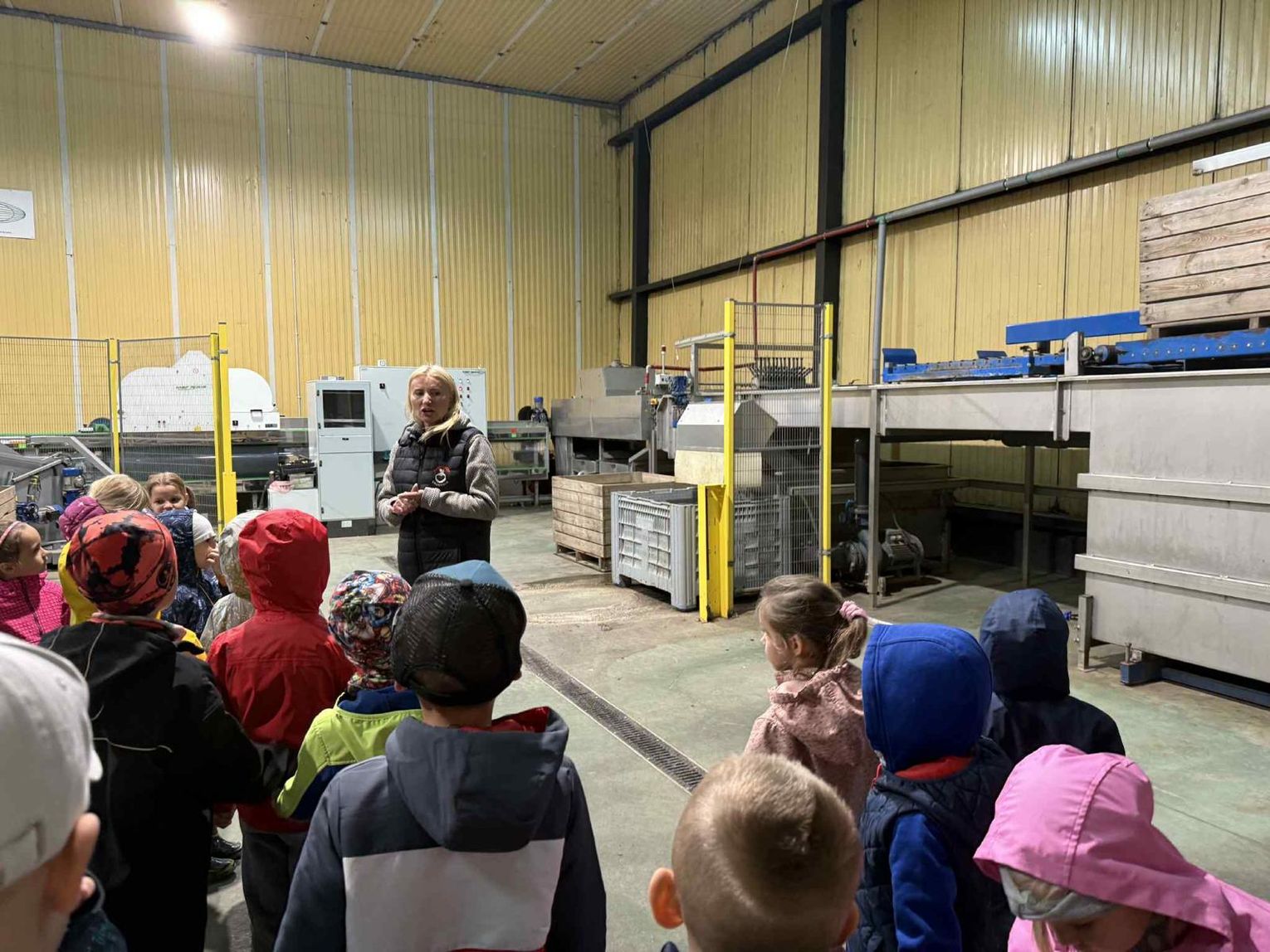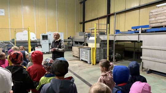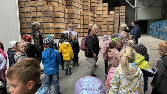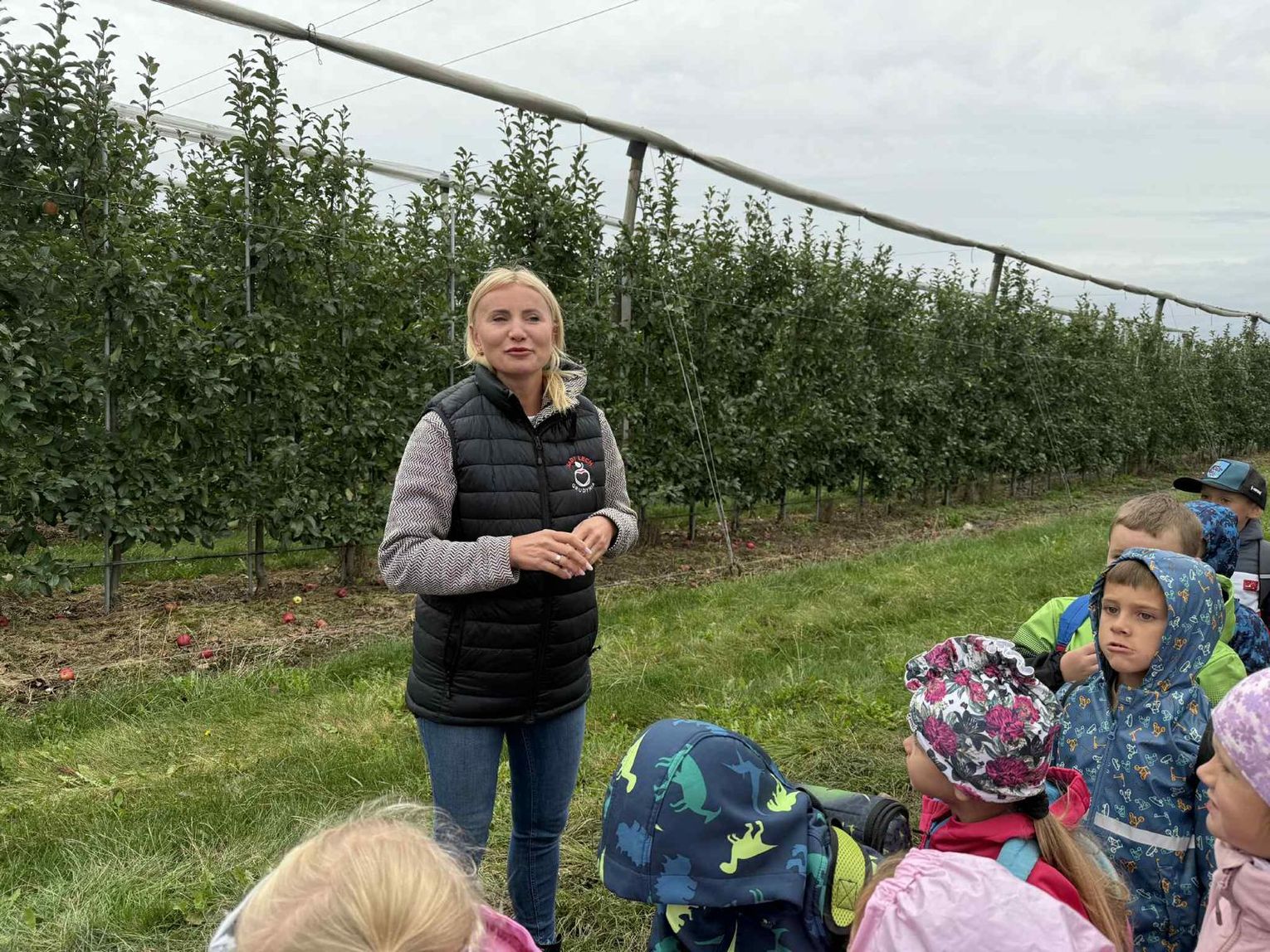 Gospodarze – państwo Marta i Arkadiusz Lechoszest – oprowadzili niecodzienną wycieczkę po swoim gospodarstwie, pokazując sprzęt potrzebny do pielęgnacji drzew i opowiadając o pracy sadownika w różnych porach roku. Nie zabrakło też praktycznej lekcji. Mali odkrywcy mieli okazję zobaczyć chłodnię, w której przechowywane są owoce.
