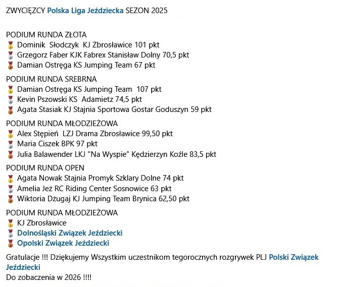 Julia skończyła sezon 2025 na podium Polskiej Ligii Jeździeckiej , w kwalifikacji indywidualnej U15 na 3 miejscu oraz w kwalifikacji Drużynowej również na 3 miejscu. To do tej pory największe osiągnięcie Julii oraz kozielskiego klubu, którego to Julia jest reprezentantem od początku swojej kariery. Wielkie brawa – czytamy na facebookowym profilu PSP nr 15.