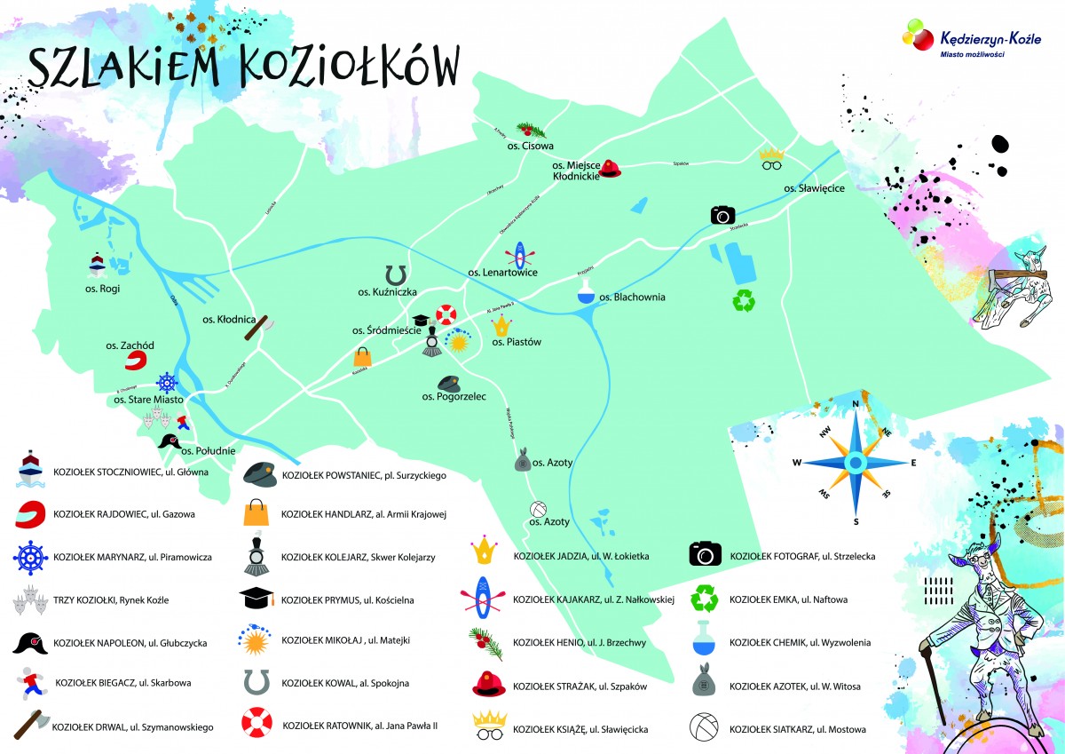 Wyróżniony przez ekspertów i doceniony przez mieszkańców folder „Szlakiem Koziołków” dostępny jest bezpłatnie w Punkcie Informacji Turystycznej w Miejskiej Bibliotece Publicznej na Rynku oraz do pobrania na stronie: https://kedzierzynkozle.pl/pl/strona/szlakiem-koziolkow.