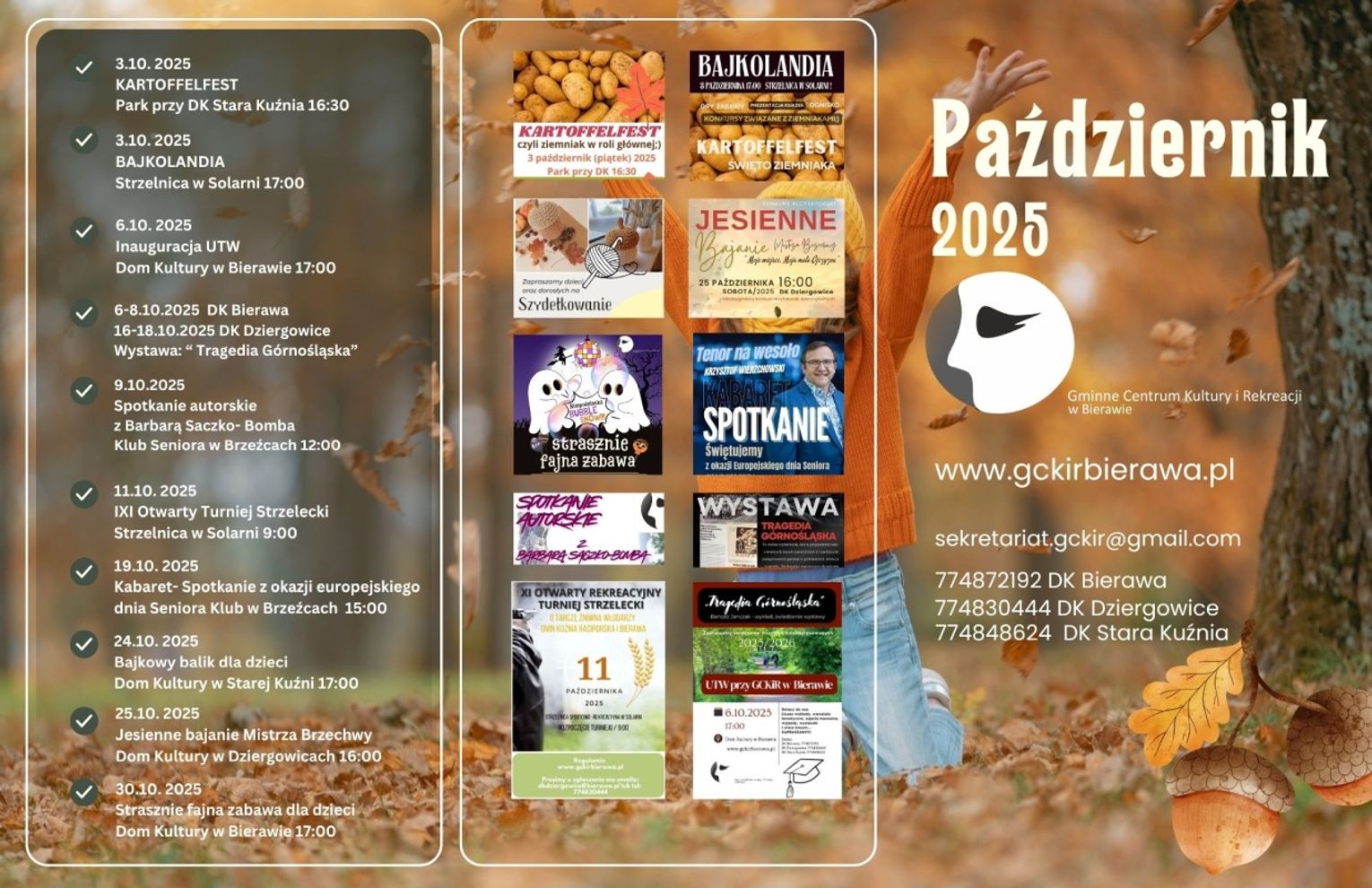 Szczegóły na załączonych plakatach. O wszystkich wydarzeniach można się dowiedzieć, odwiedzając stronę internetową GCKiR w Bierawie